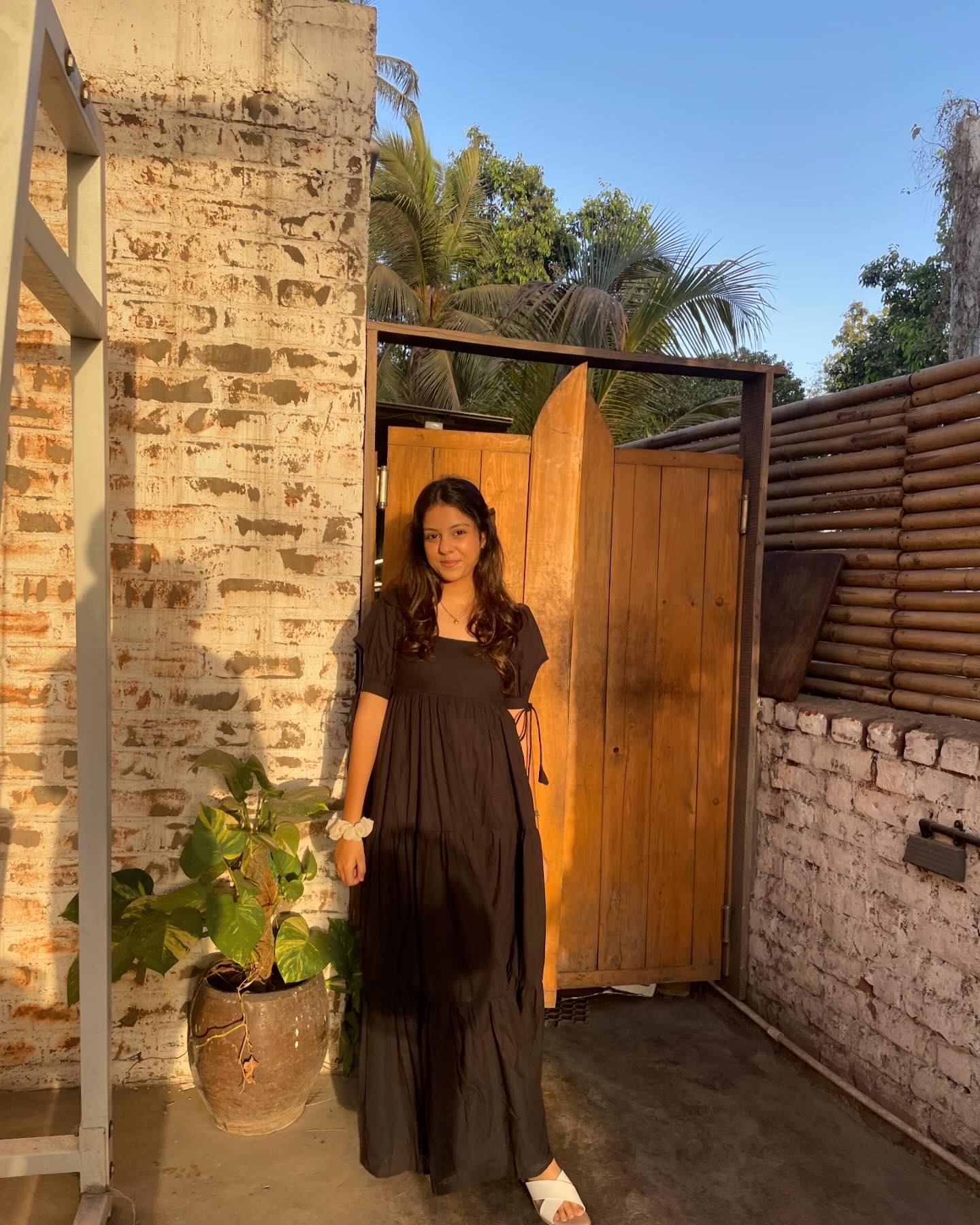 Elevate your wardrobe with our elegant 'Black Jack' Maxi dress, featuring a timeless square neckline and a chic back knot detail. The puff knotted sleeves add a touch of romantic flair, while the breathable 100% cotton ensures comfort and style. Perfect for both casual outings and sophisticated gatherings, this Maxi dress combines classic design with modern accents for a truly versatile addition to your collection.