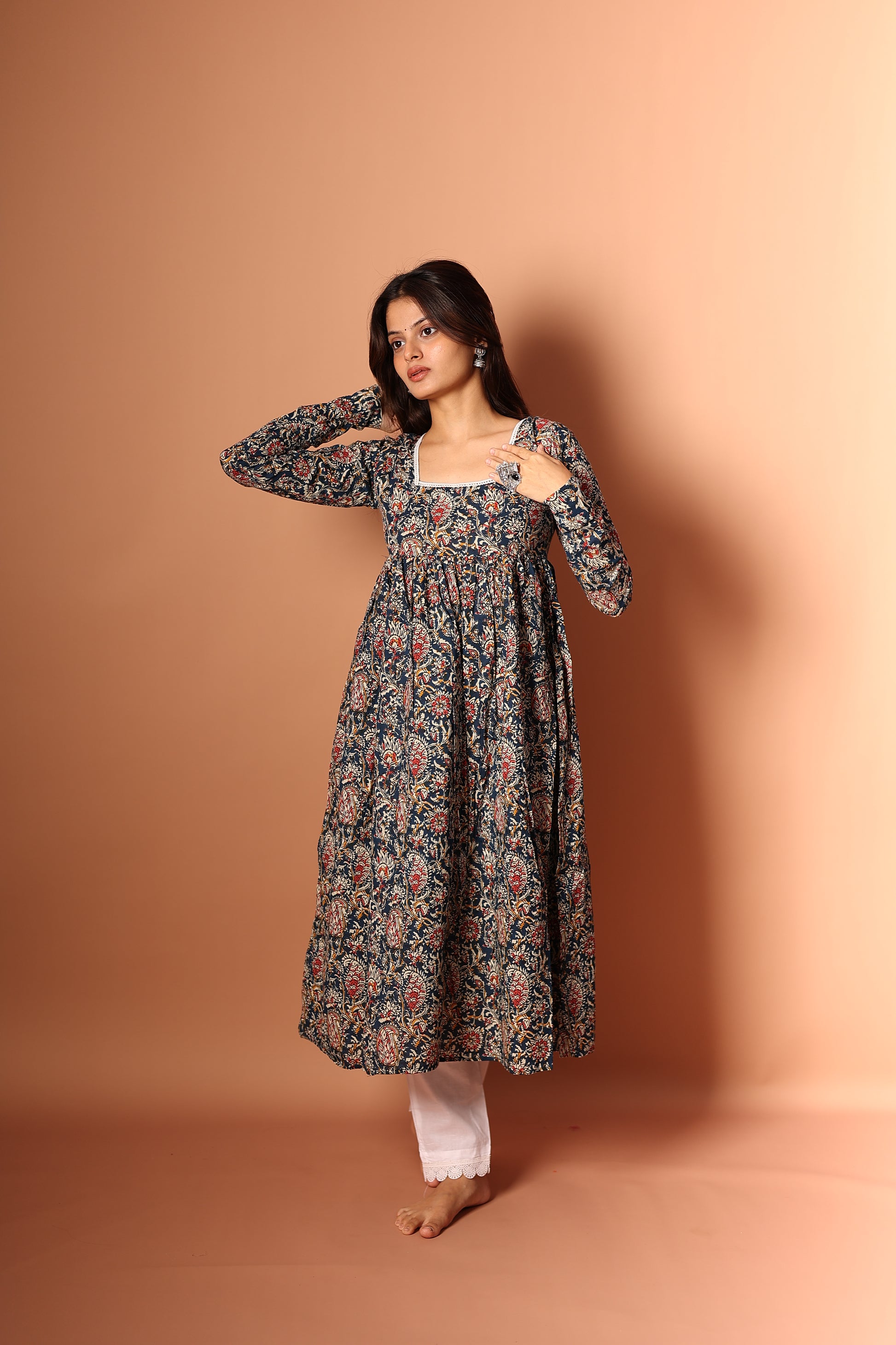 This pure cotton Anarkali kurta set is a perfect blend of elegance and comfort. The kurta features a square neckline at the front and back, with intricate lace detailing along the neck. It is paired with matching pure cotton white pants, which also showcase delicate lace accents. Ideal for both festive and casual occasions, this set offers a timeless, sophisticated look.