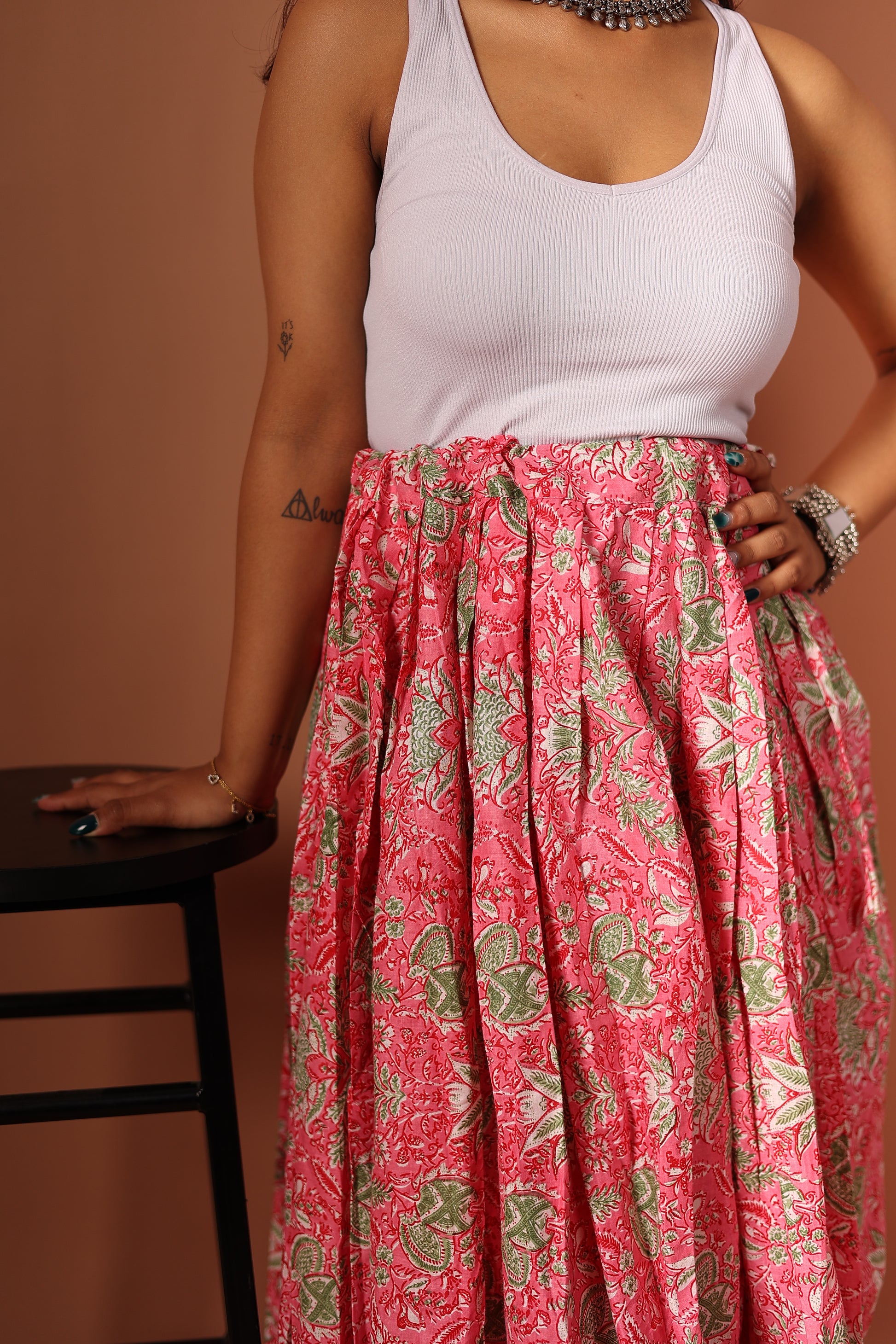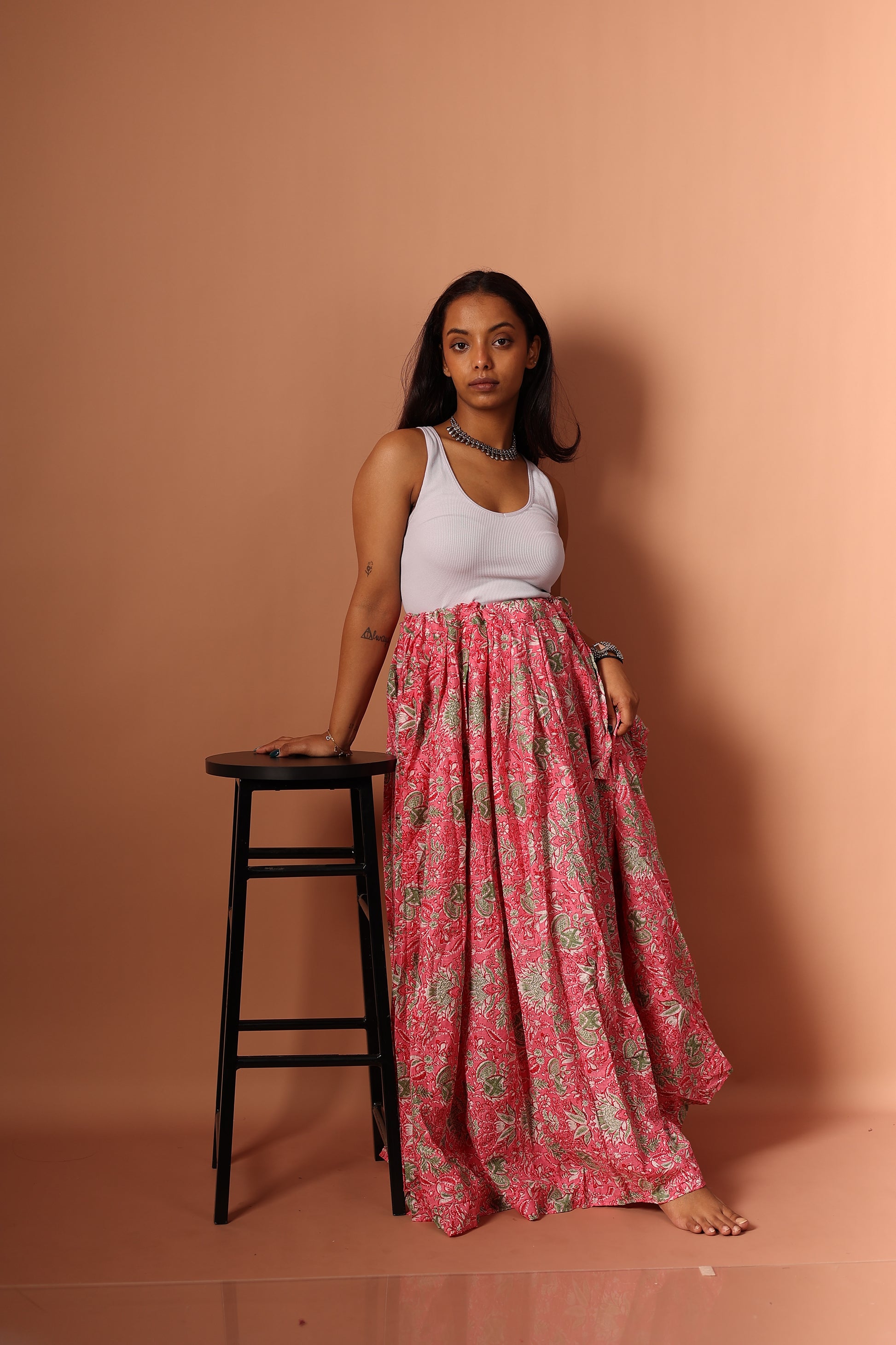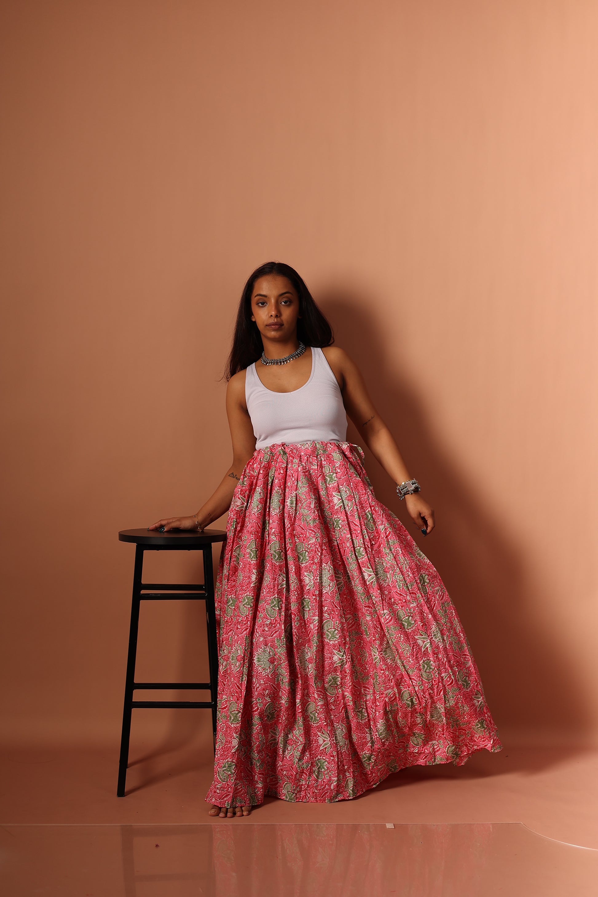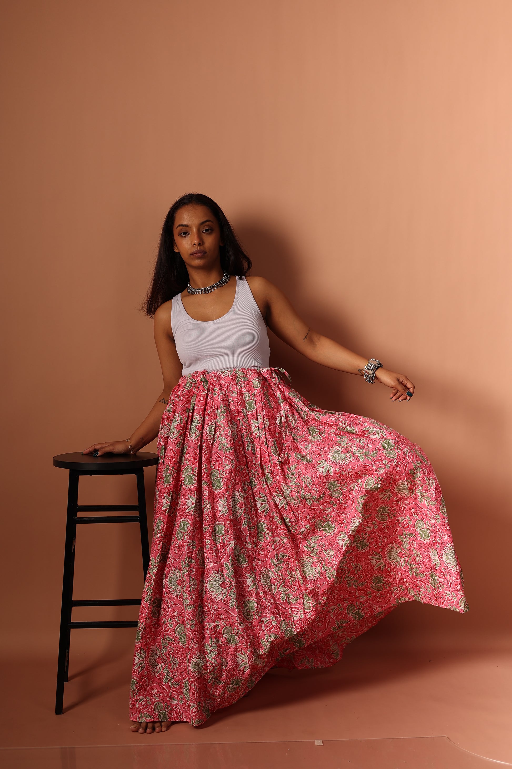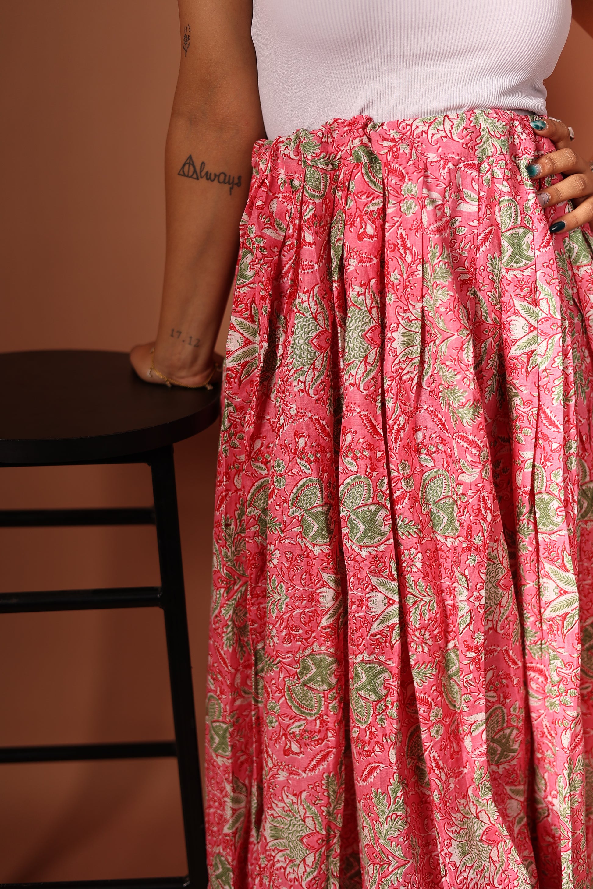 This Pure Cotton Blue Maxi Skirt features a unique table print, blending traditional motifs with modern style. Made from 100% breathable cotton, it offers comfort and a flattering flow. The pink color adds a pop of elegance, perfect for both casual outings and special occasions. With an elastic waistband, it ensures a comfortable, effortless fit. Pair it with a simple top to let the skirt shine.