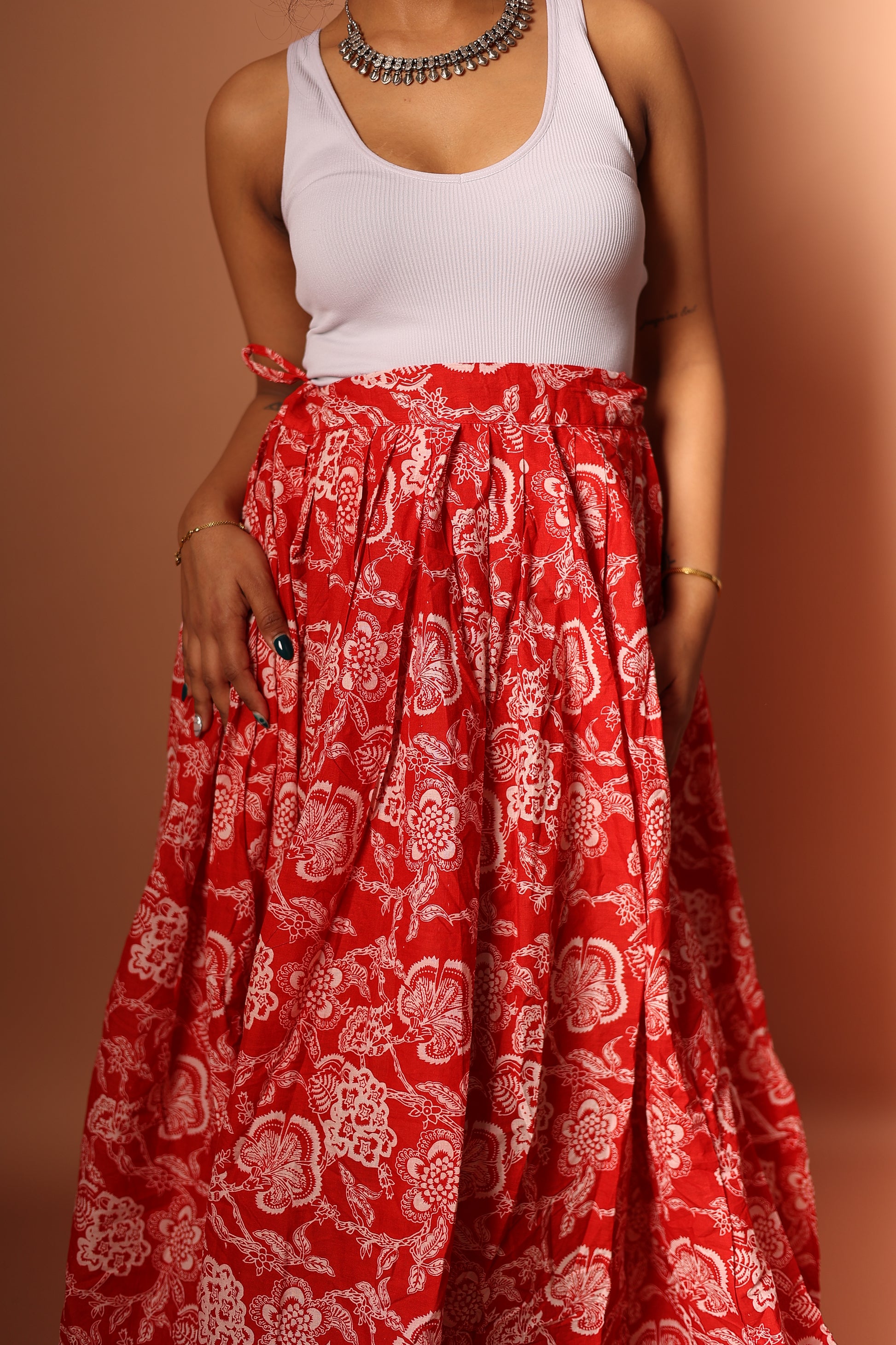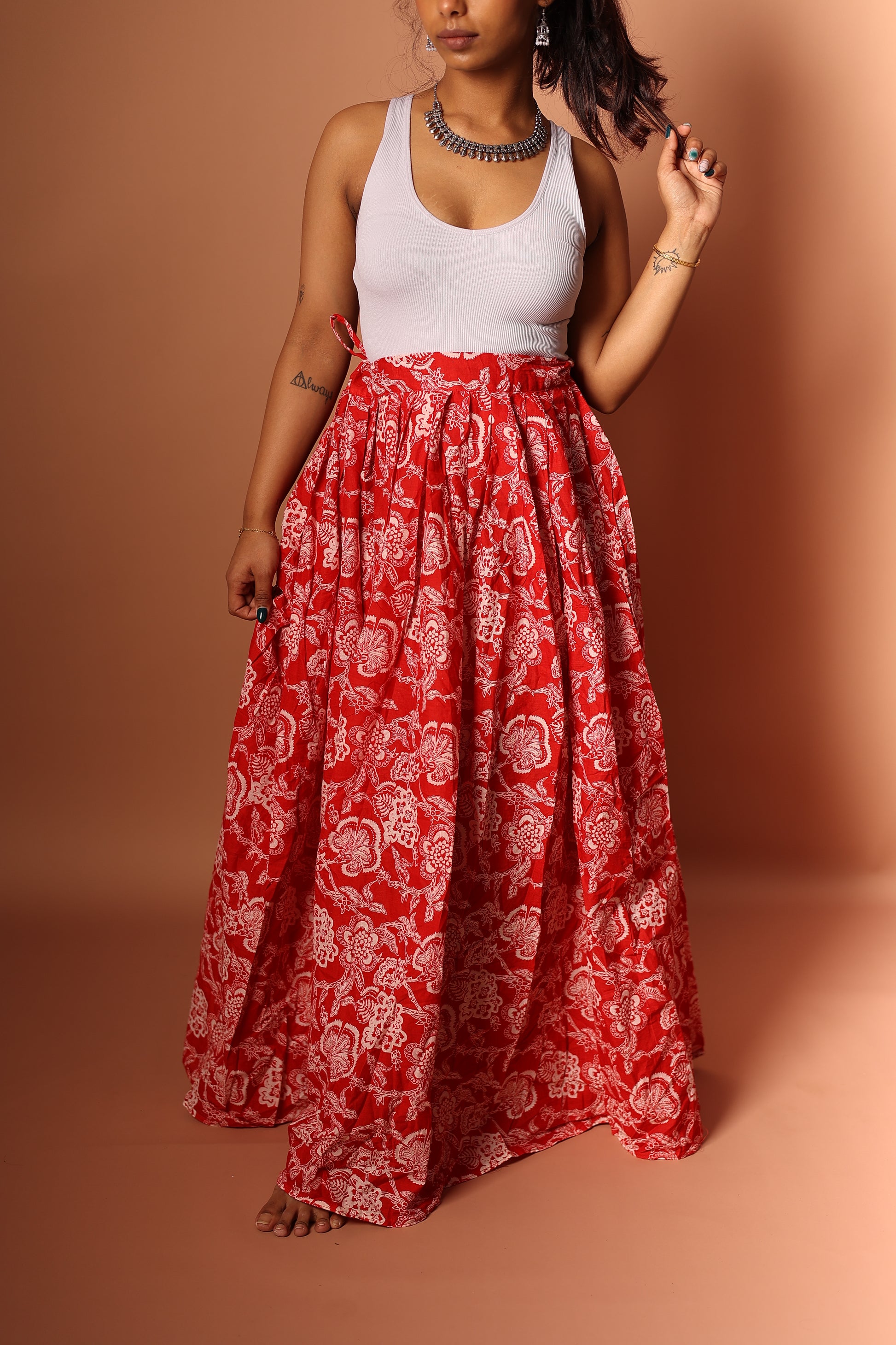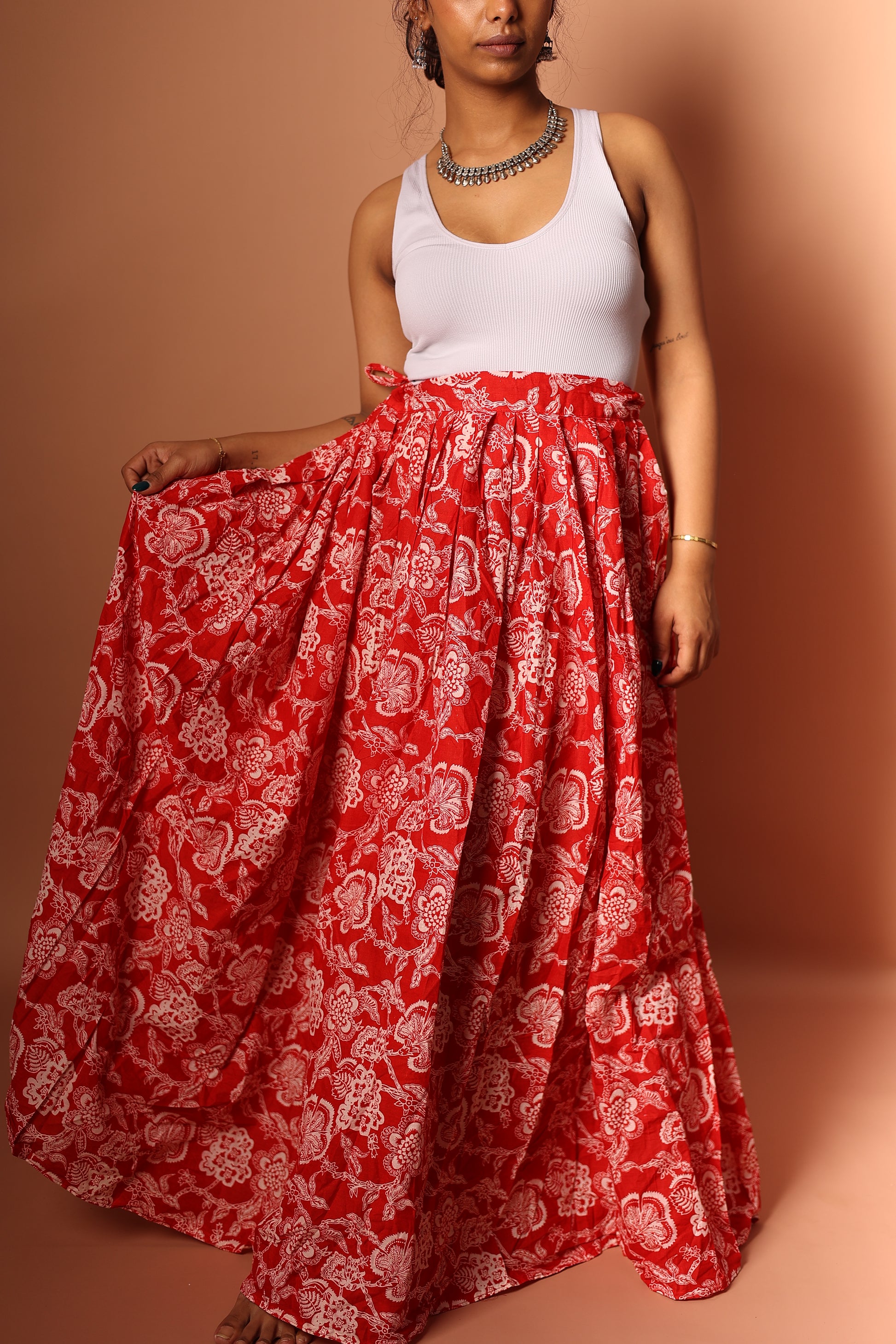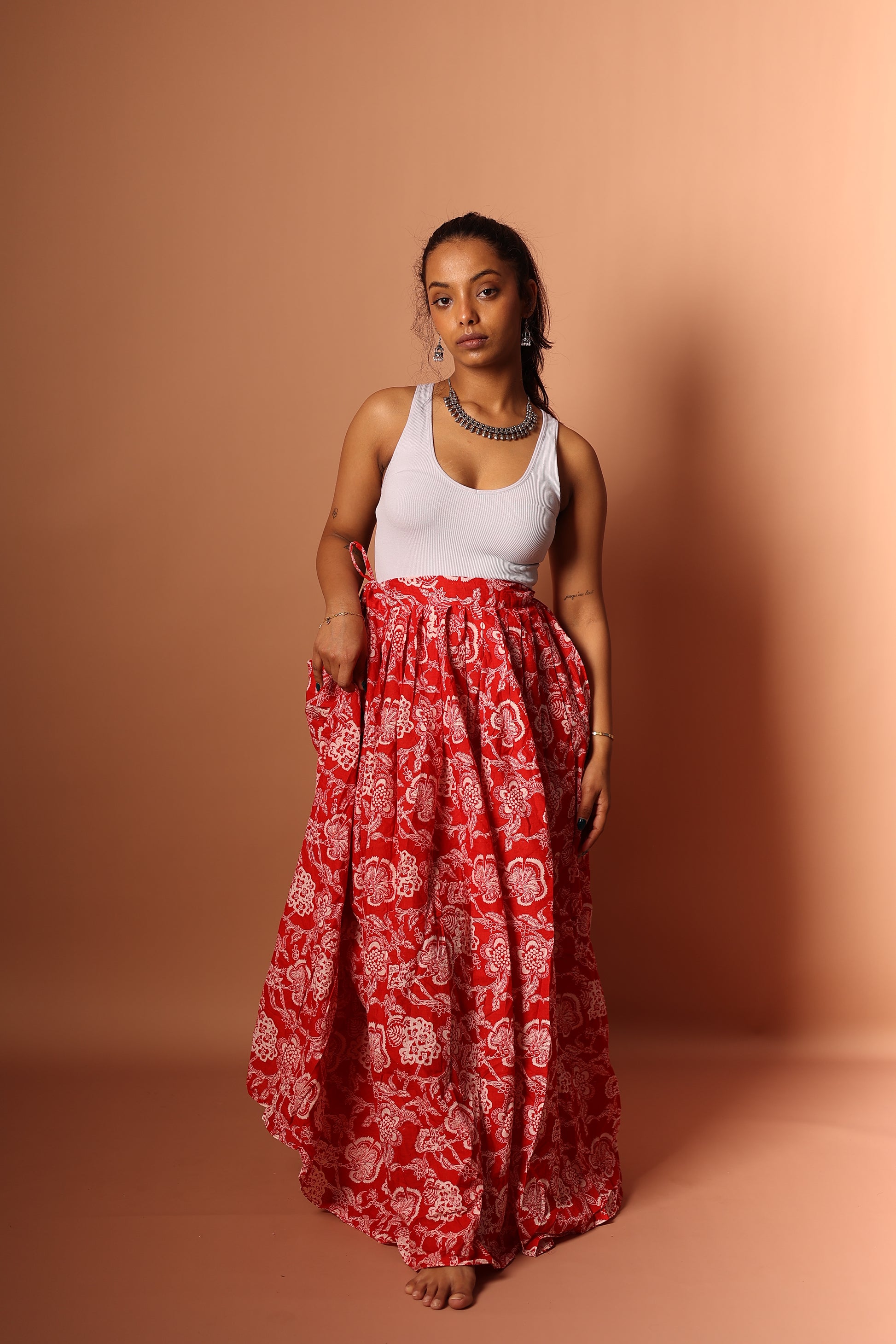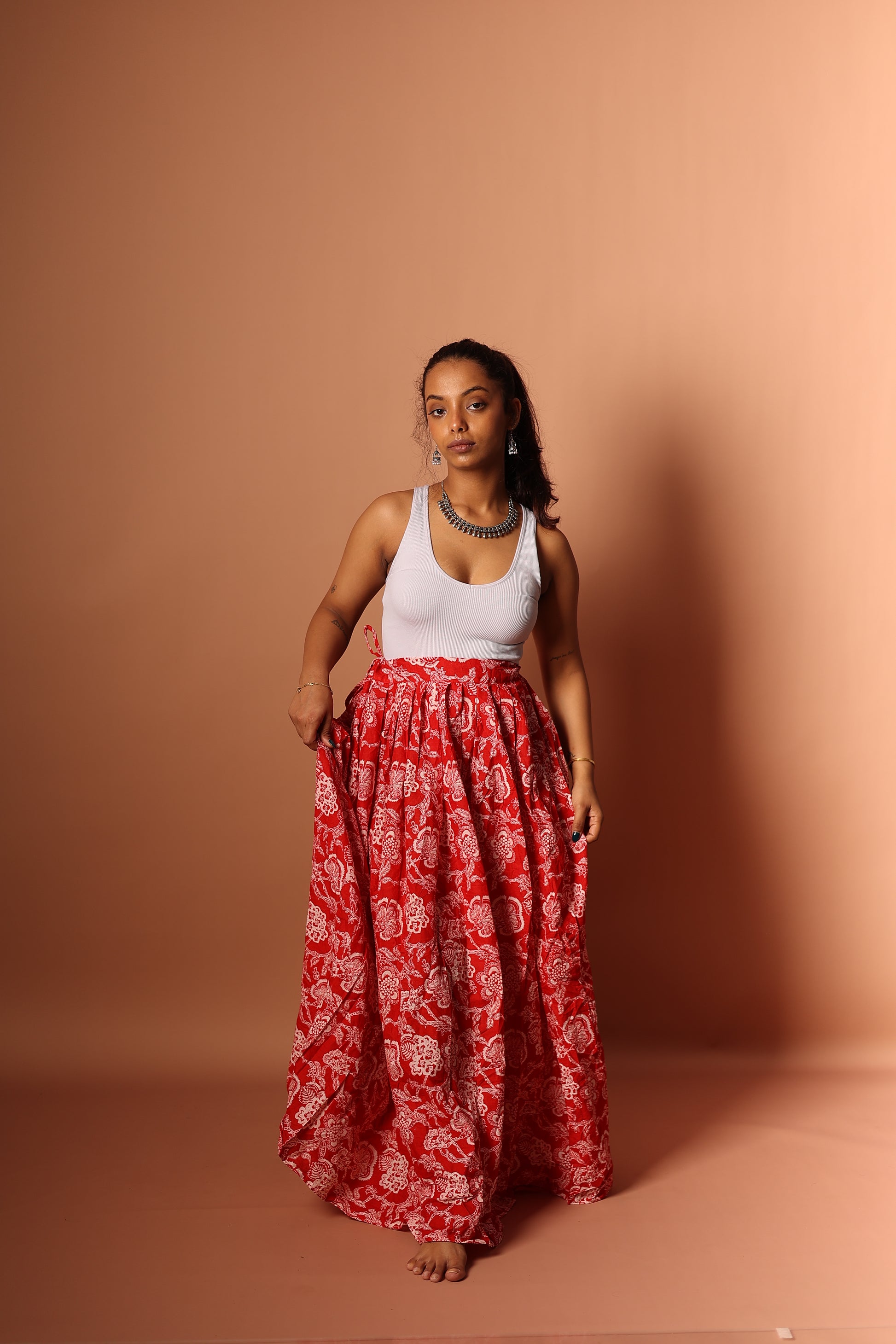 This Pure Cotton Blue Maxi Skirt features a unique table print, blending traditional motifs with modern style. Made from 100% breathable cotton, it offers comfort and a flattering flow. The vibrant red color adds a pop of elegance, perfect for both casual outings and special occasions. With an elastic waistband, it ensures a comfortable, effortless fit. Pair it with a simple top to let the skirt shine.
