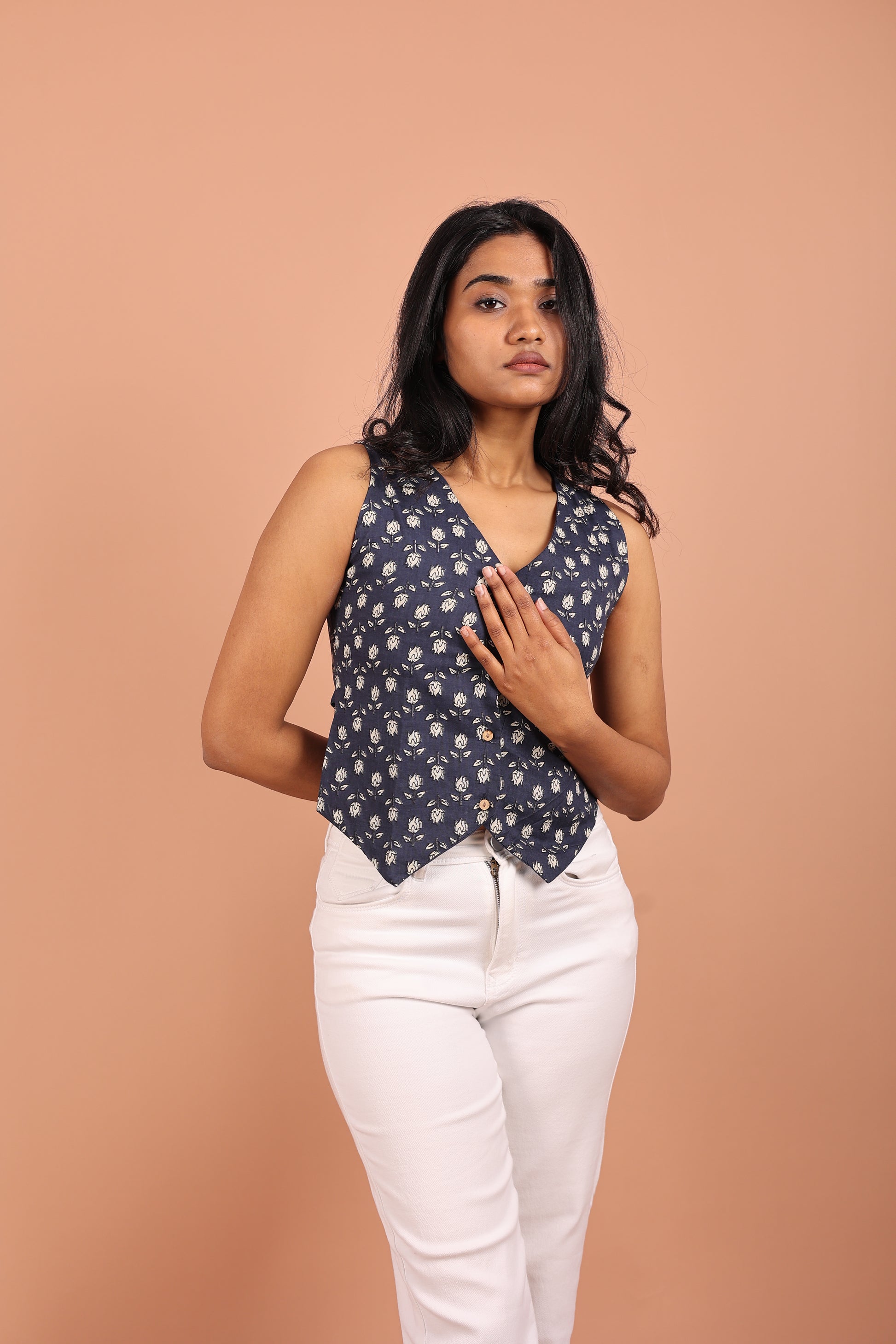 This pure cotton vest blends comfort with a touch of desi, adding a hint of traditional charm to a modern, versatile design. Made from soft, breathable cotton, it ensures all day comfort. The design is versatile enough to be dressed up or down, making it ideal for both casual outings and festive gatherings. Its simple yet striking silhouette effortlessly combines contemporary fashion with a timeless Indian aesthetic, offering a unique piece that stands out in any wardrobe.