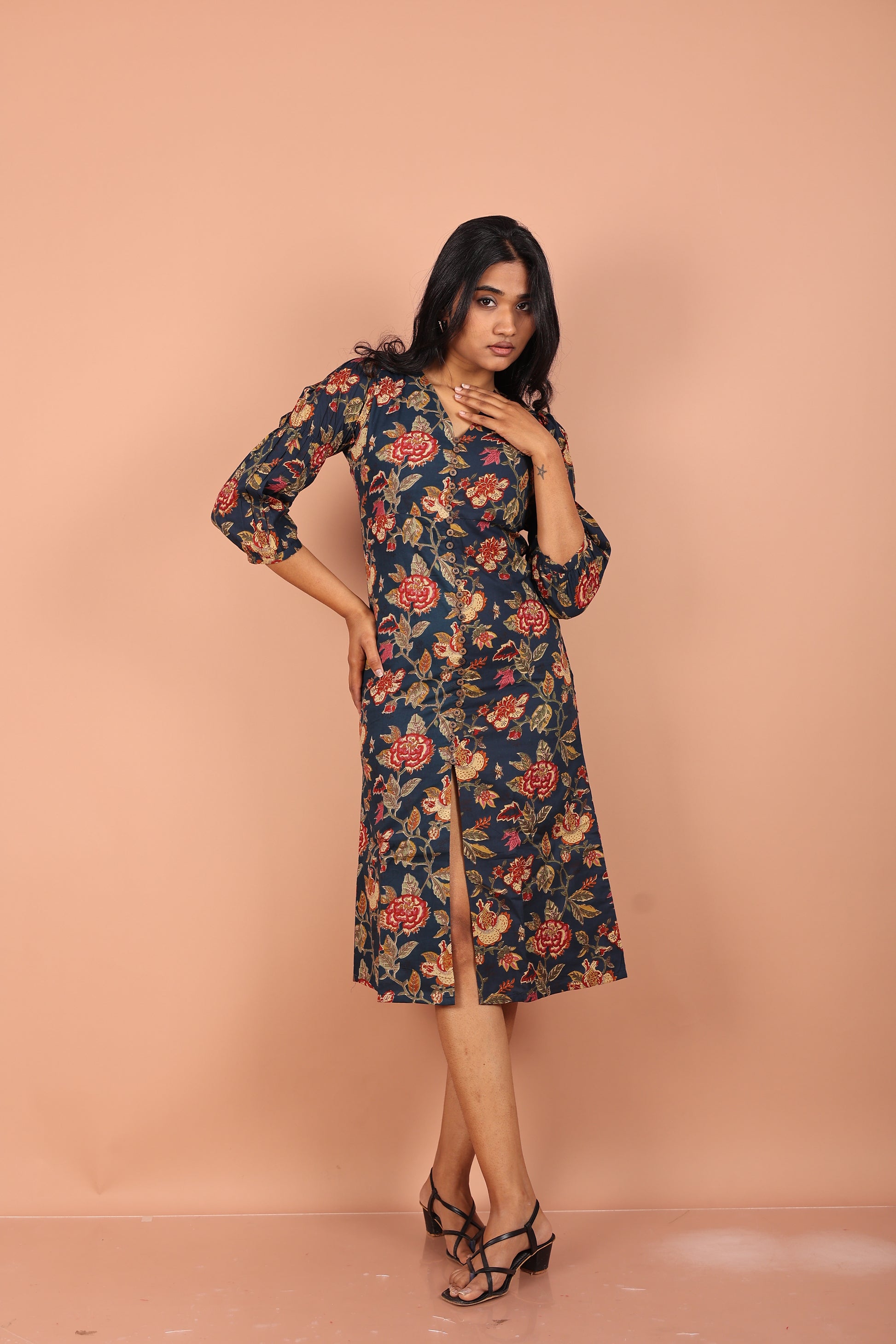 This elegant floral-printed dress features 3/4th sleeves for a breezy, casual vibe and a stylish front slit for added movement and charm. Perfect for daytime outings or casual evening gatherings, this dress effortlessly blends comfort and femininity.