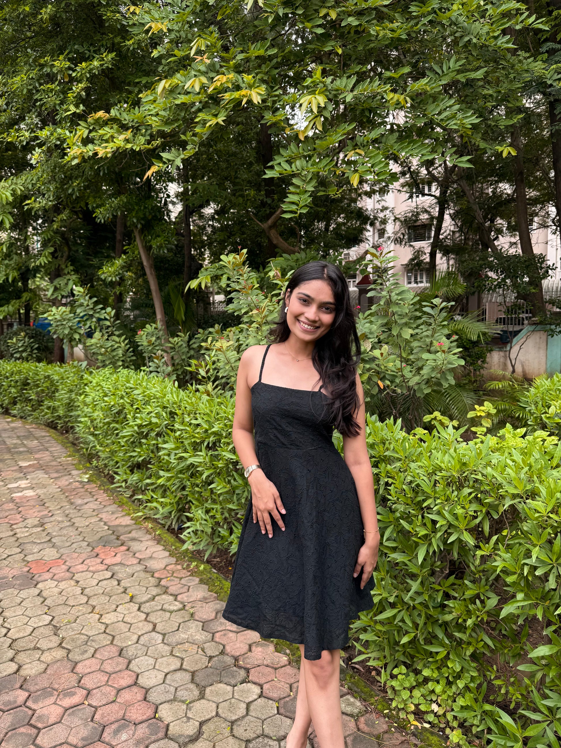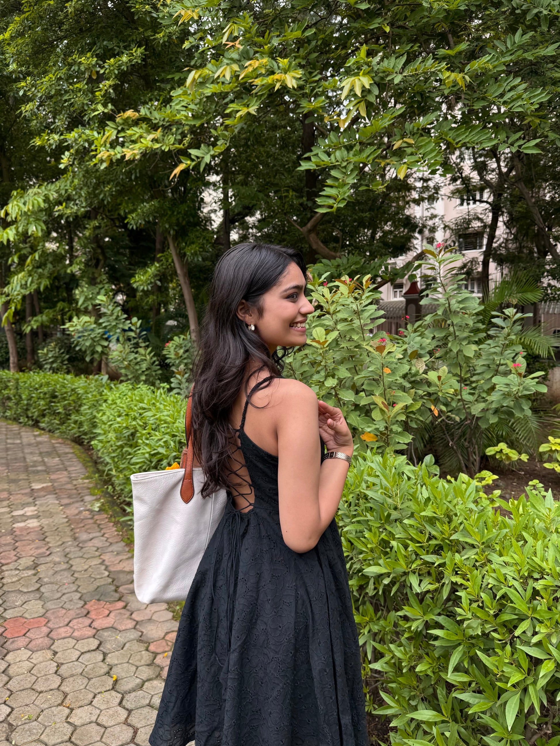 A black schiffli stunner made to keep the compliments coming (and the nazar away). Features an adjustable corset back for the perfect fit — stitched just for you, on order.