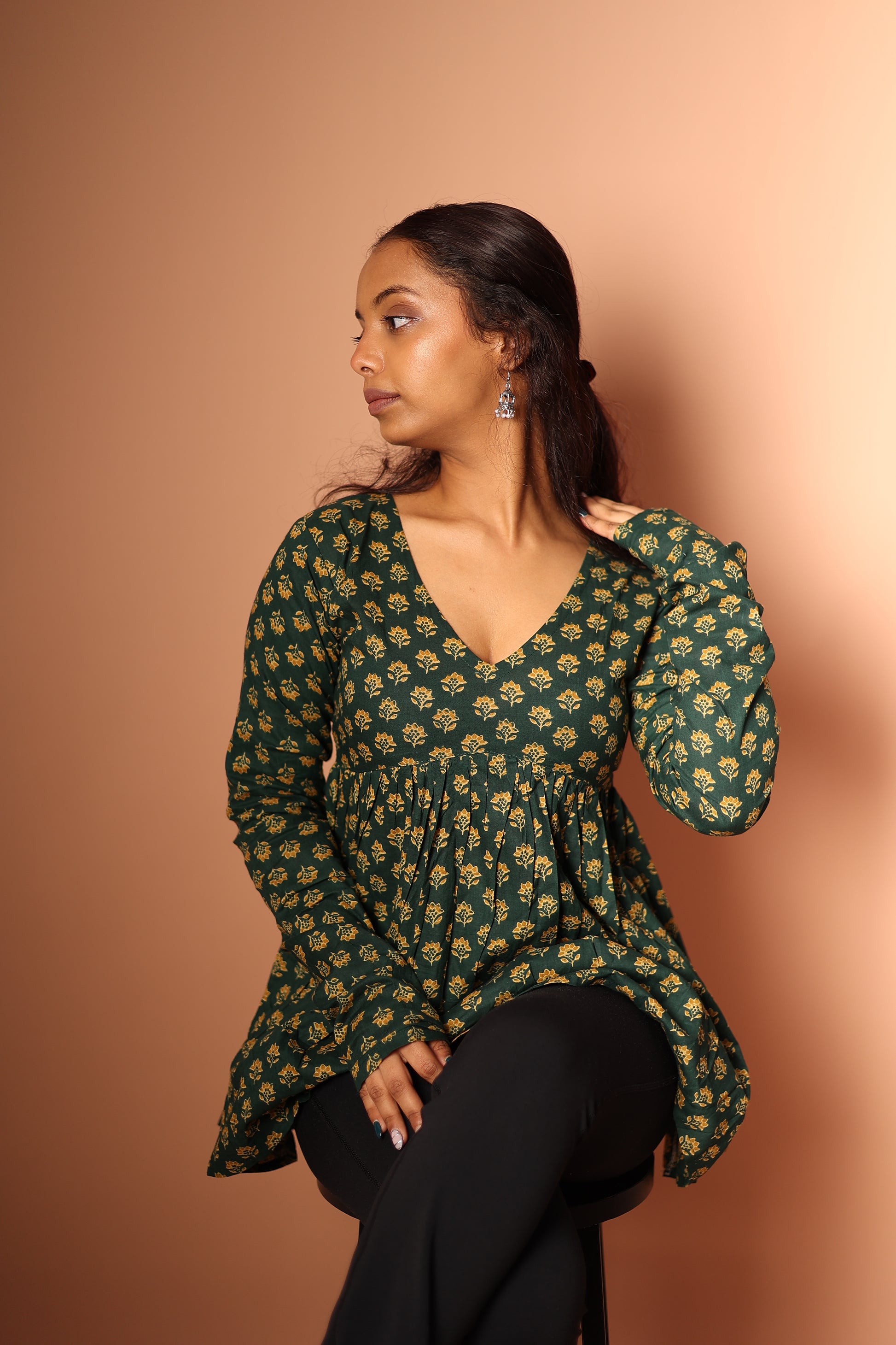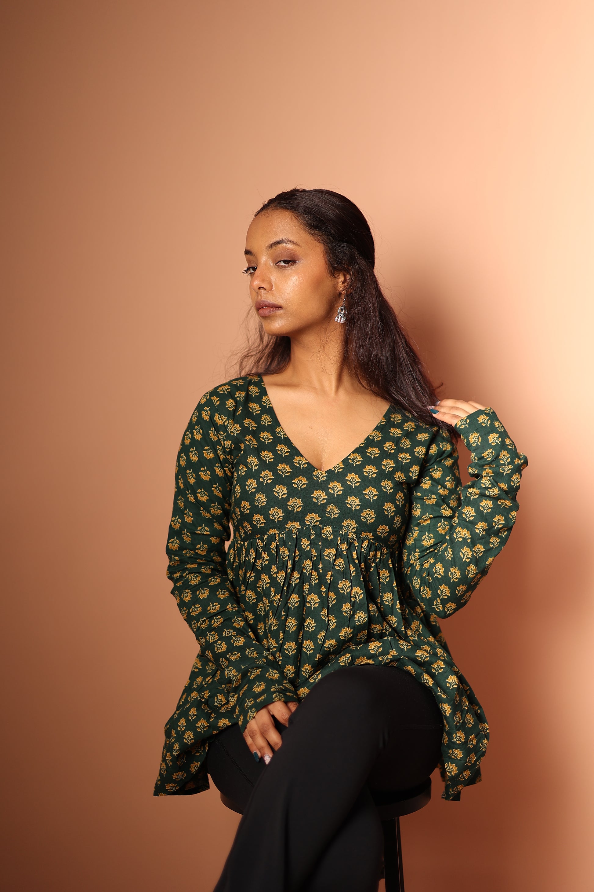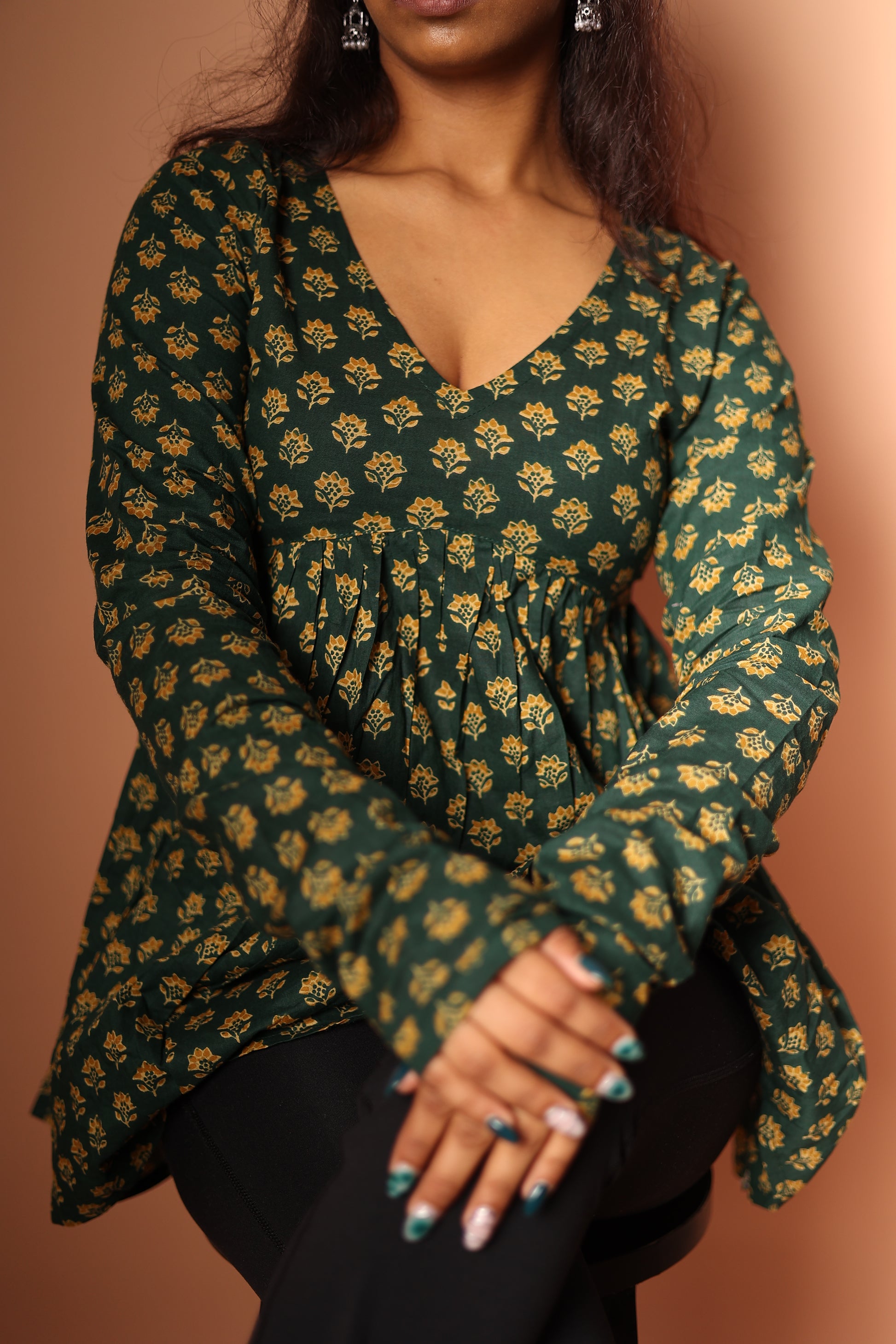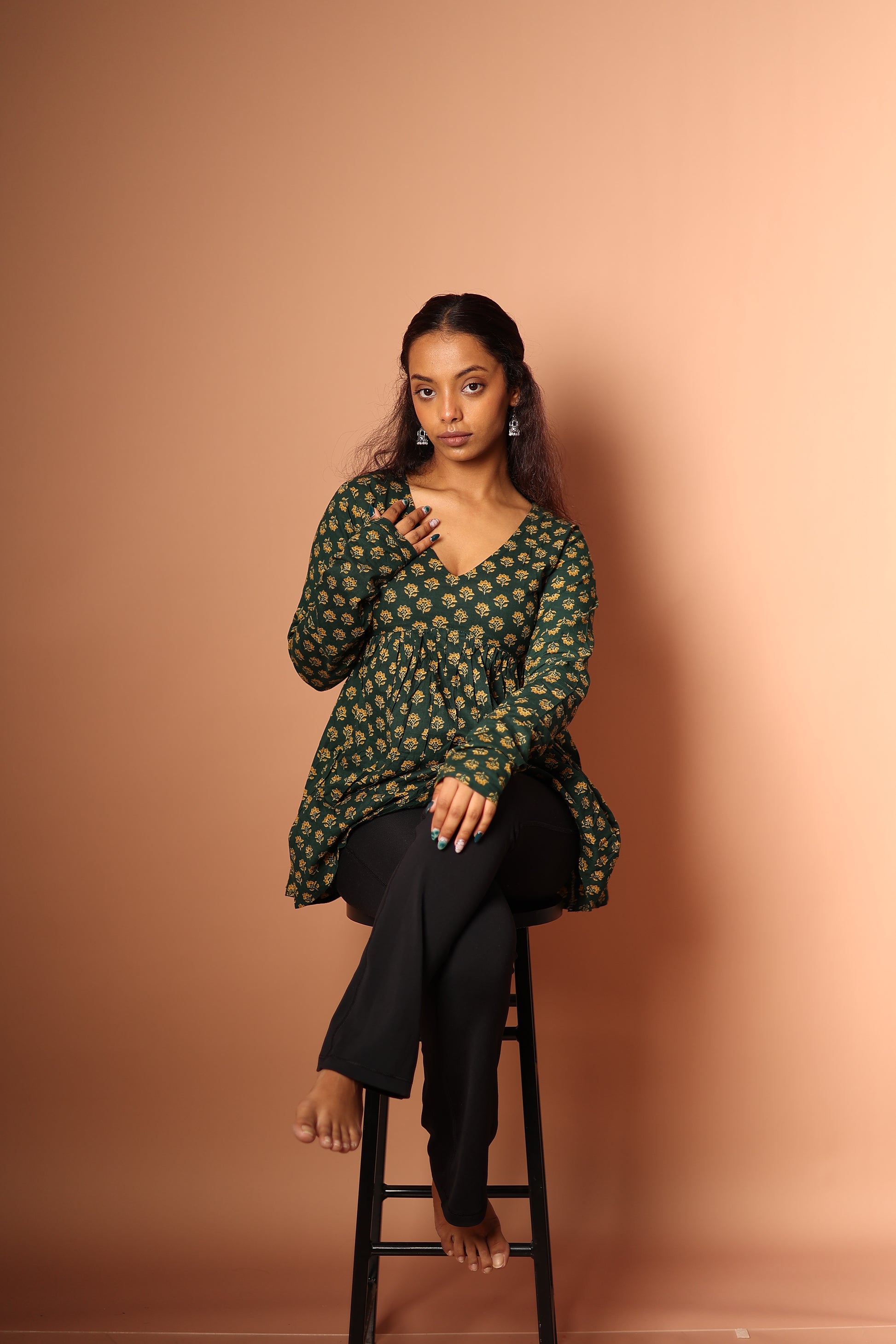 This full-sleeve peplum top is crafted from pure cotton, offering comfort and breathability. Its flattering peplum silhouette adds a touch of elegance, making it perfect for both casual and semi-formal looks. Pair it with jeans or skirts for a versatile, stylish outfit.