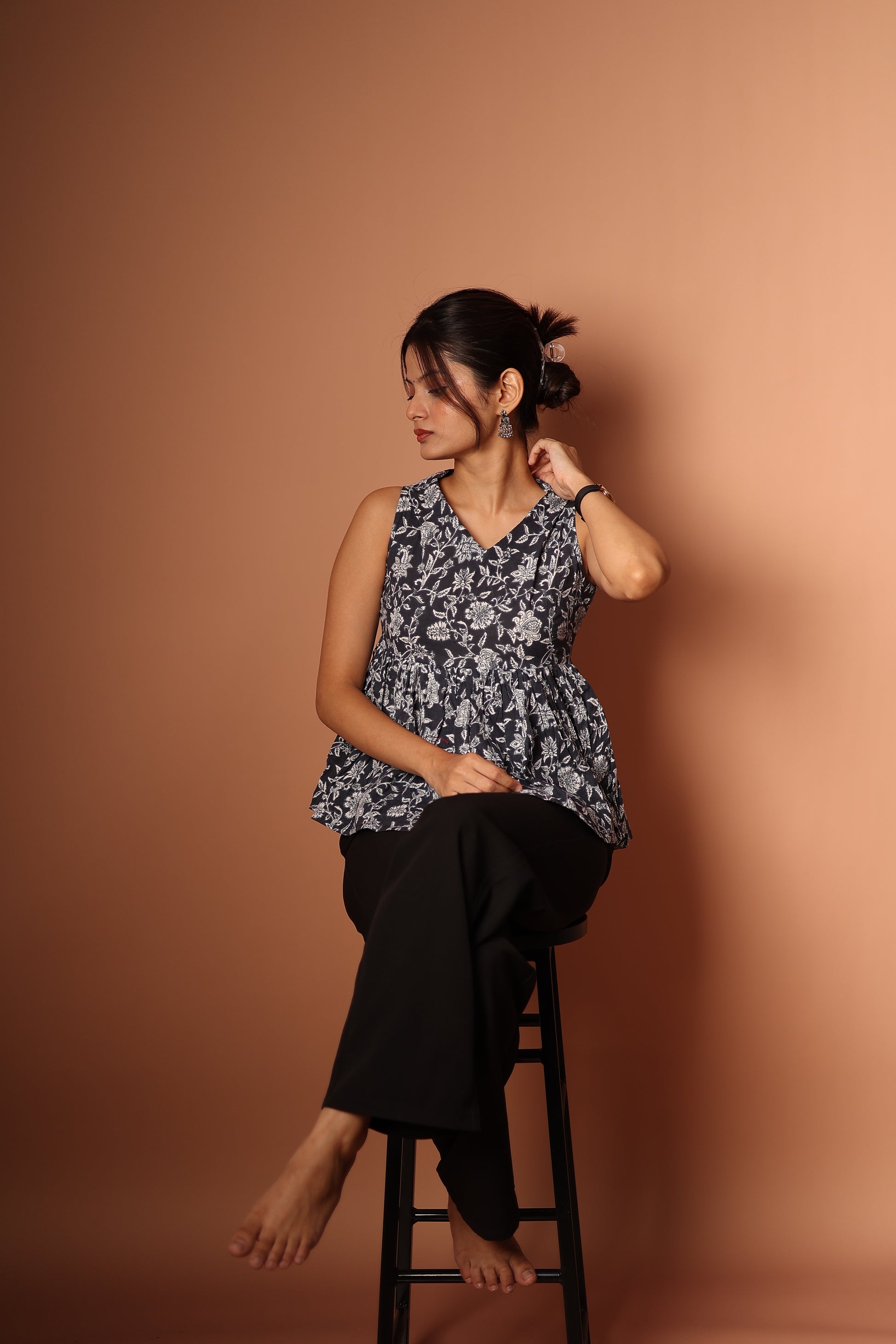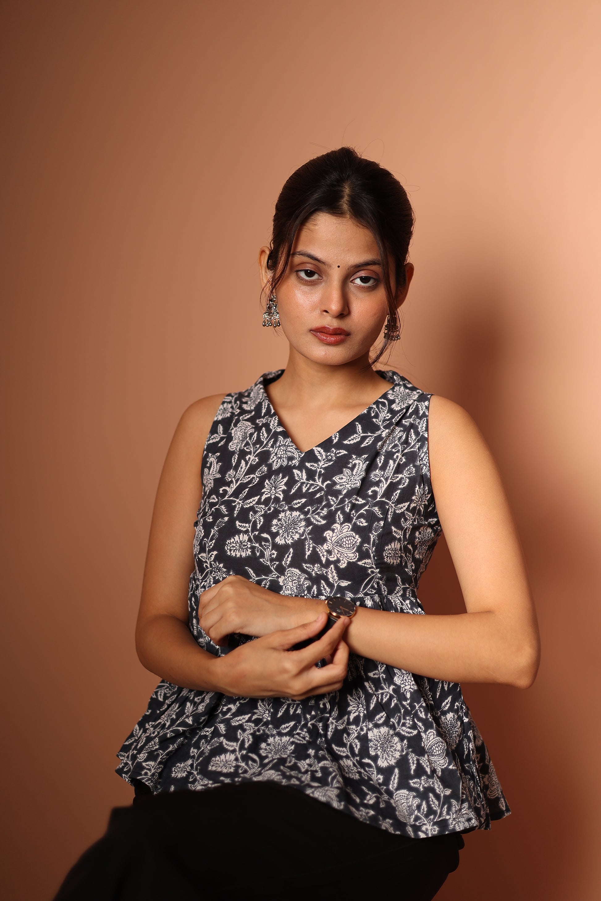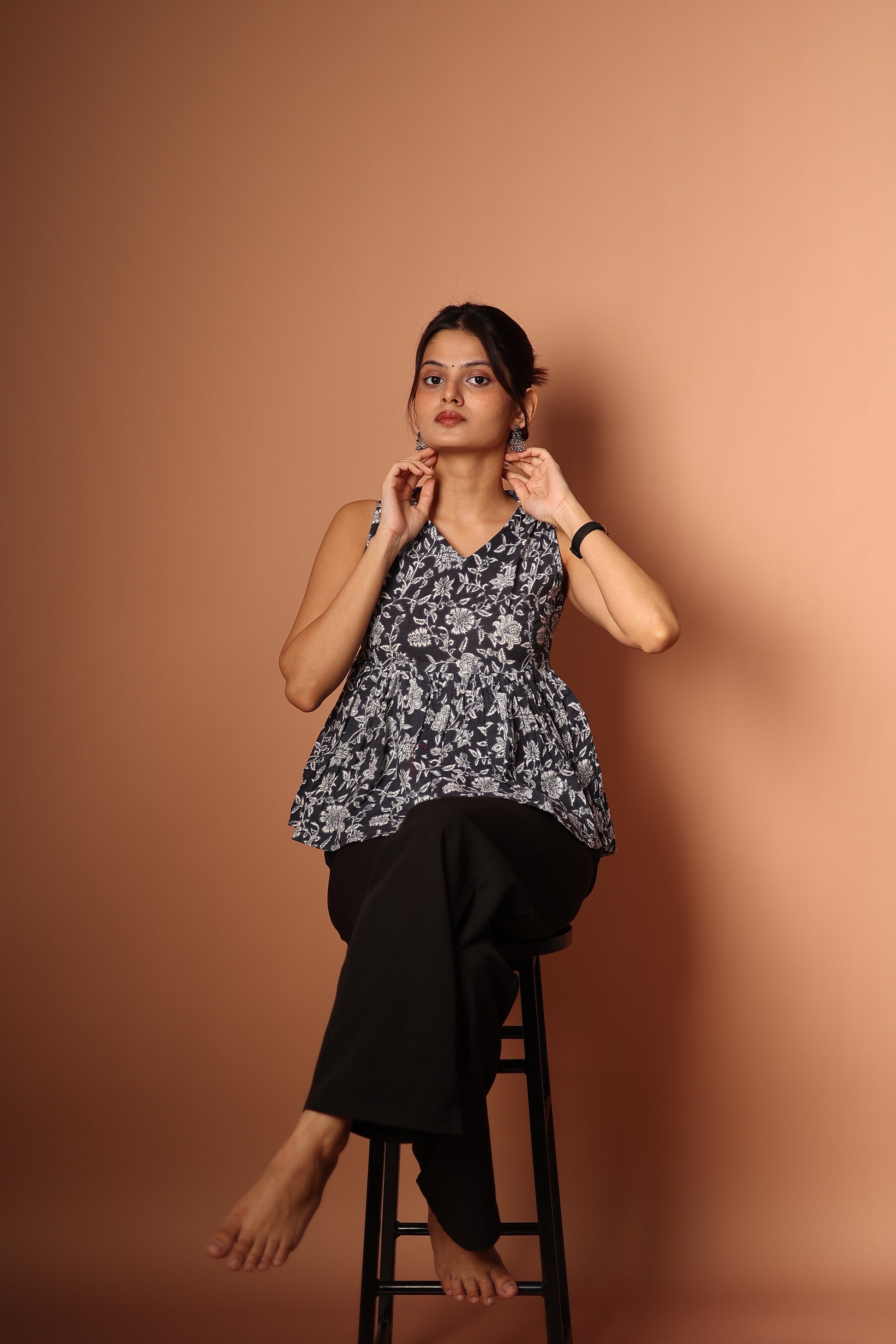 This sleeveless peplum top is crafted from pure cotton, offering comfort and breathability. Its flattering peplum silhouette adds a touch of elegance, making it perfect for both casual and semi-formal looks. Pair it with jeans or skirts for a versatile, stylish outfit.