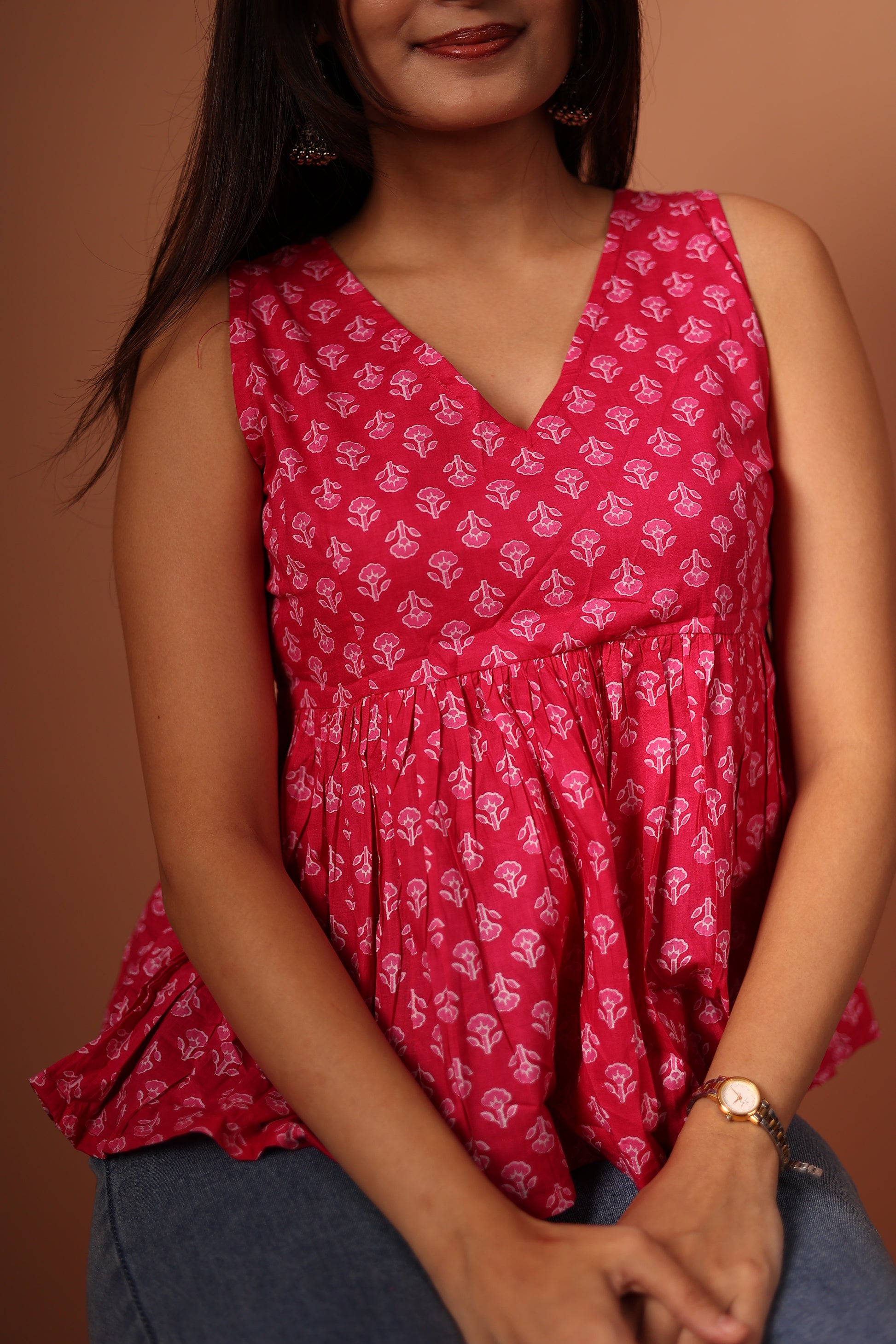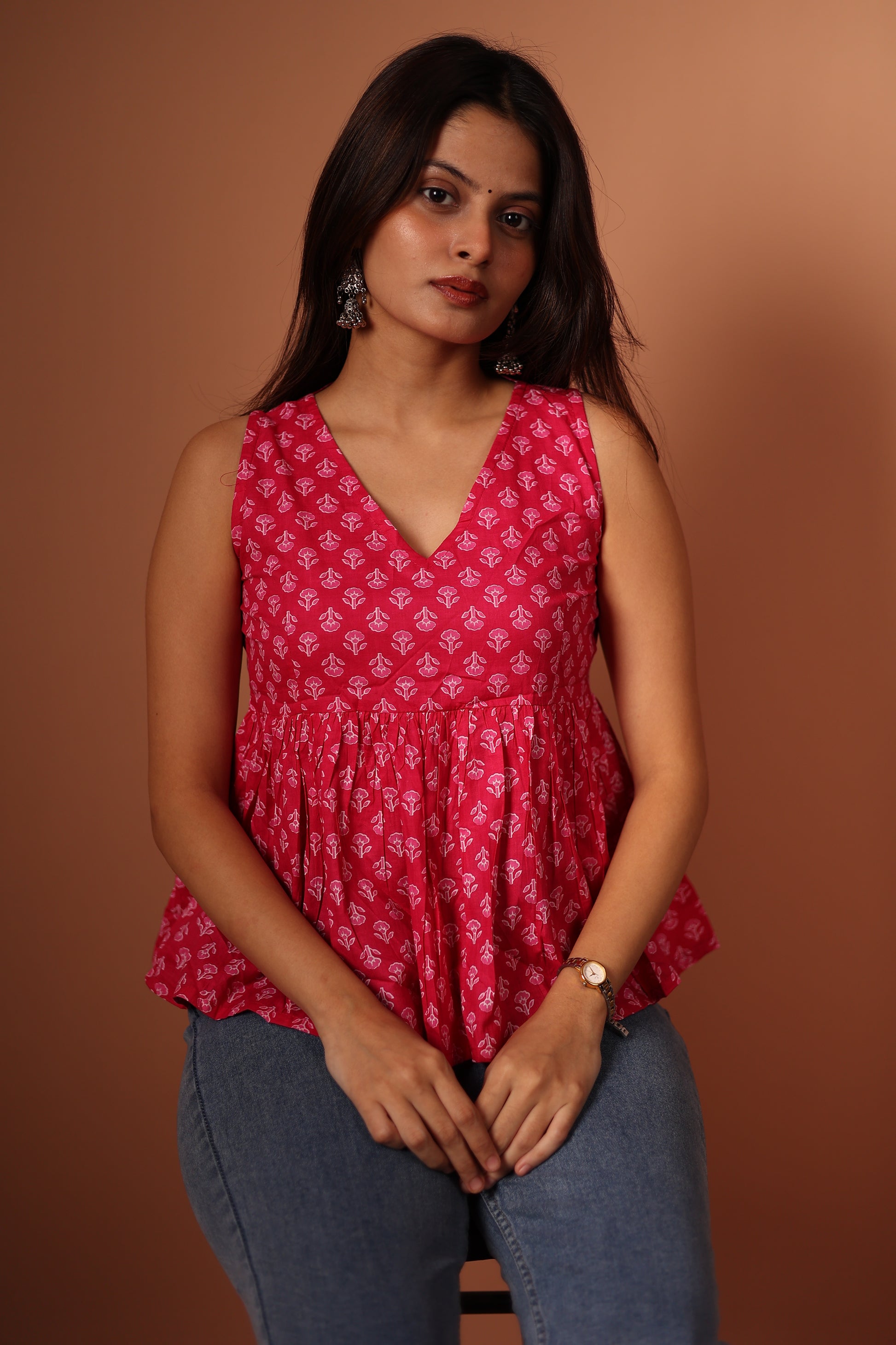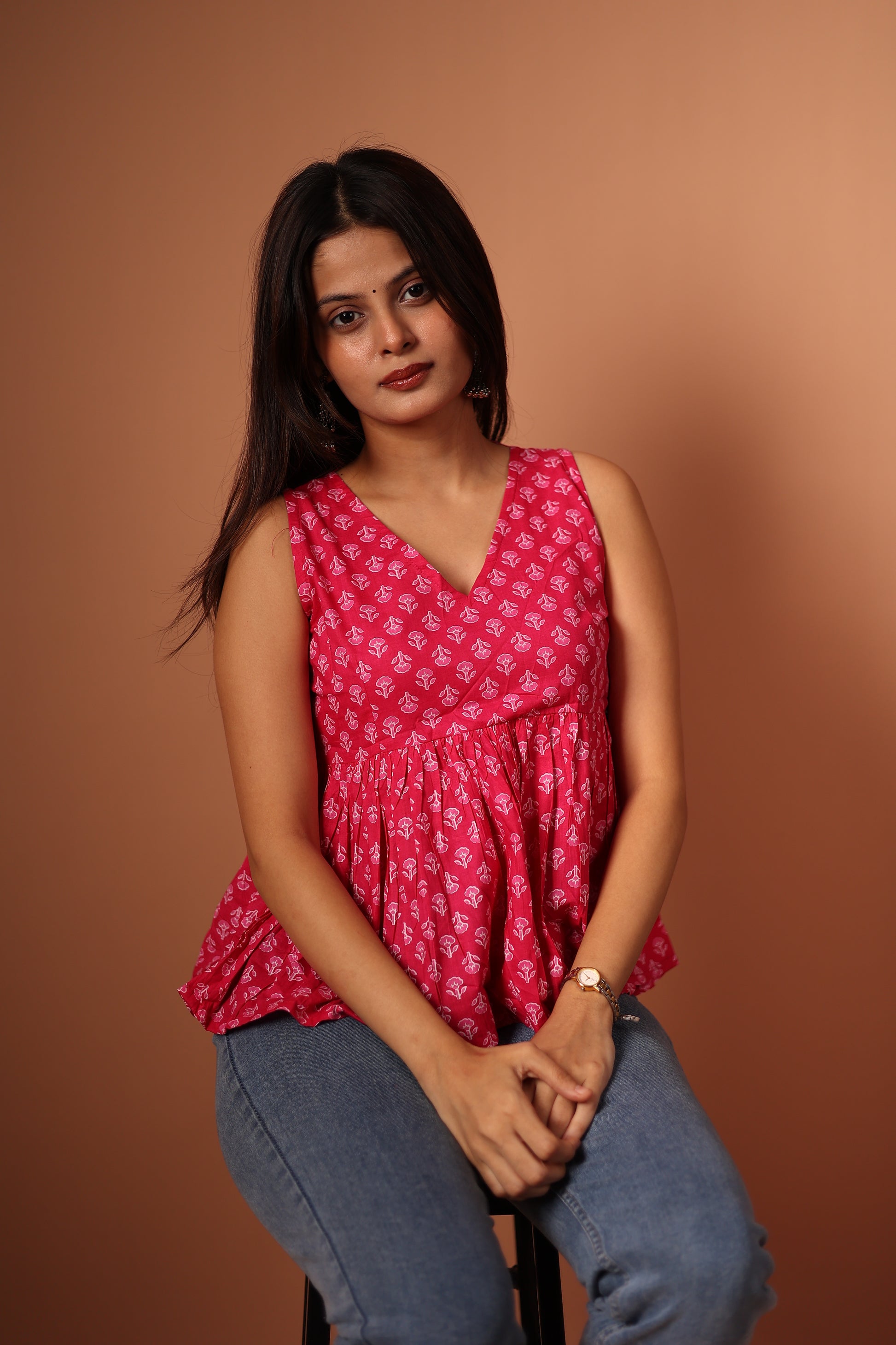 This sleeveless peplum top is crafted from pure cotton, offering comfort and breathability. Its flattering peplum silhouette adds a touch of elegance, making it perfect for both casual and semi-formal looks. Pair it with jeans or skirts for a versatile, stylish outfit.