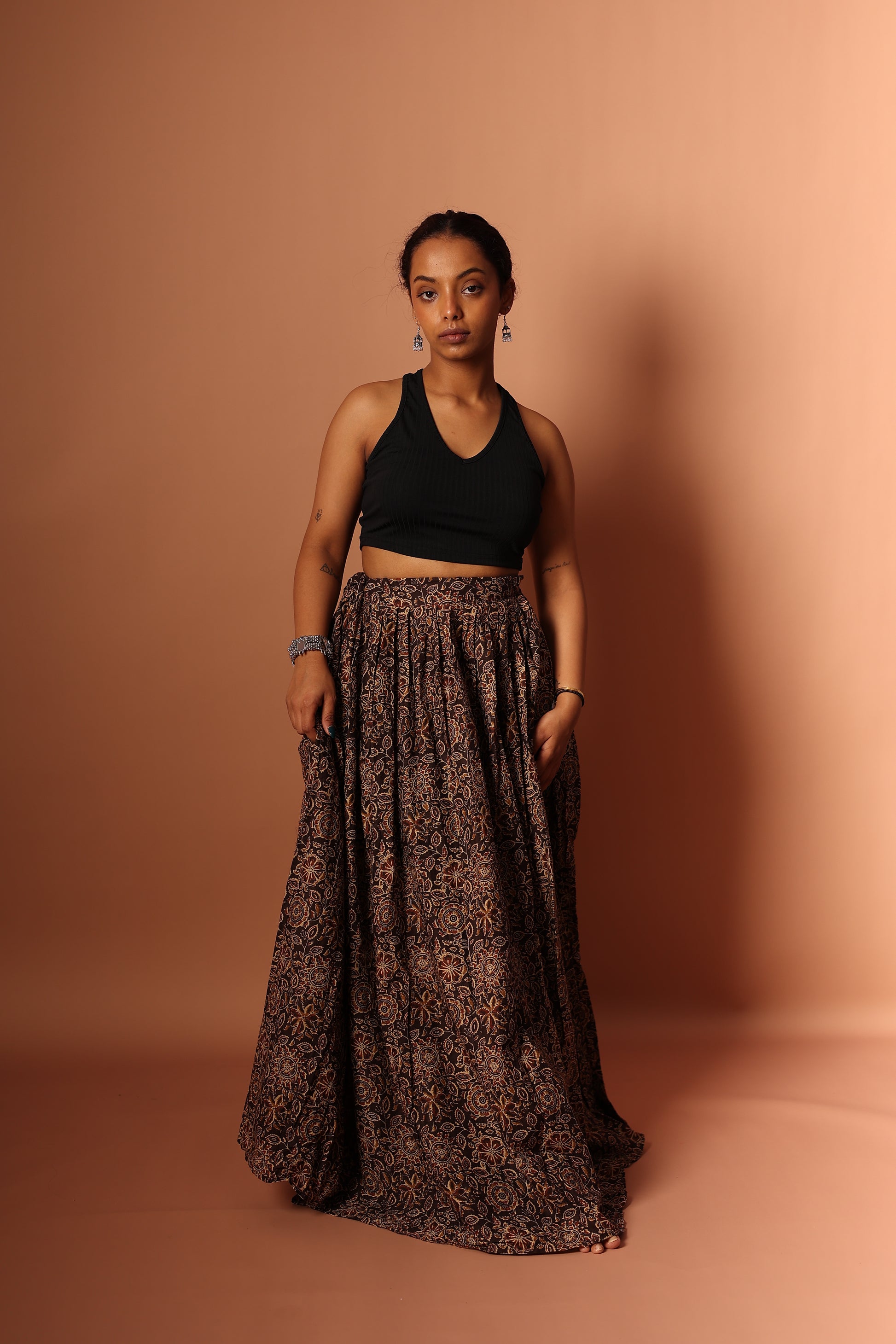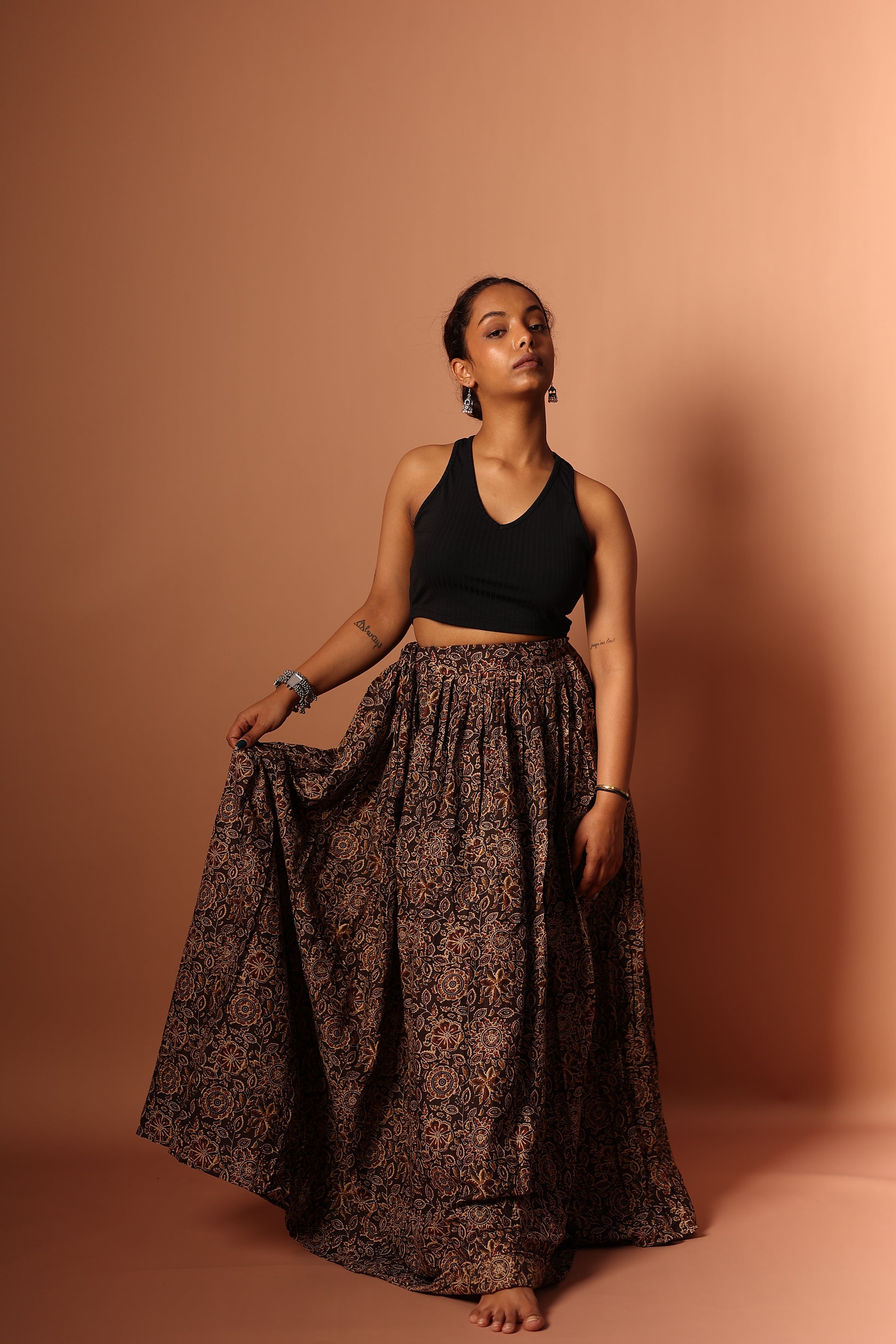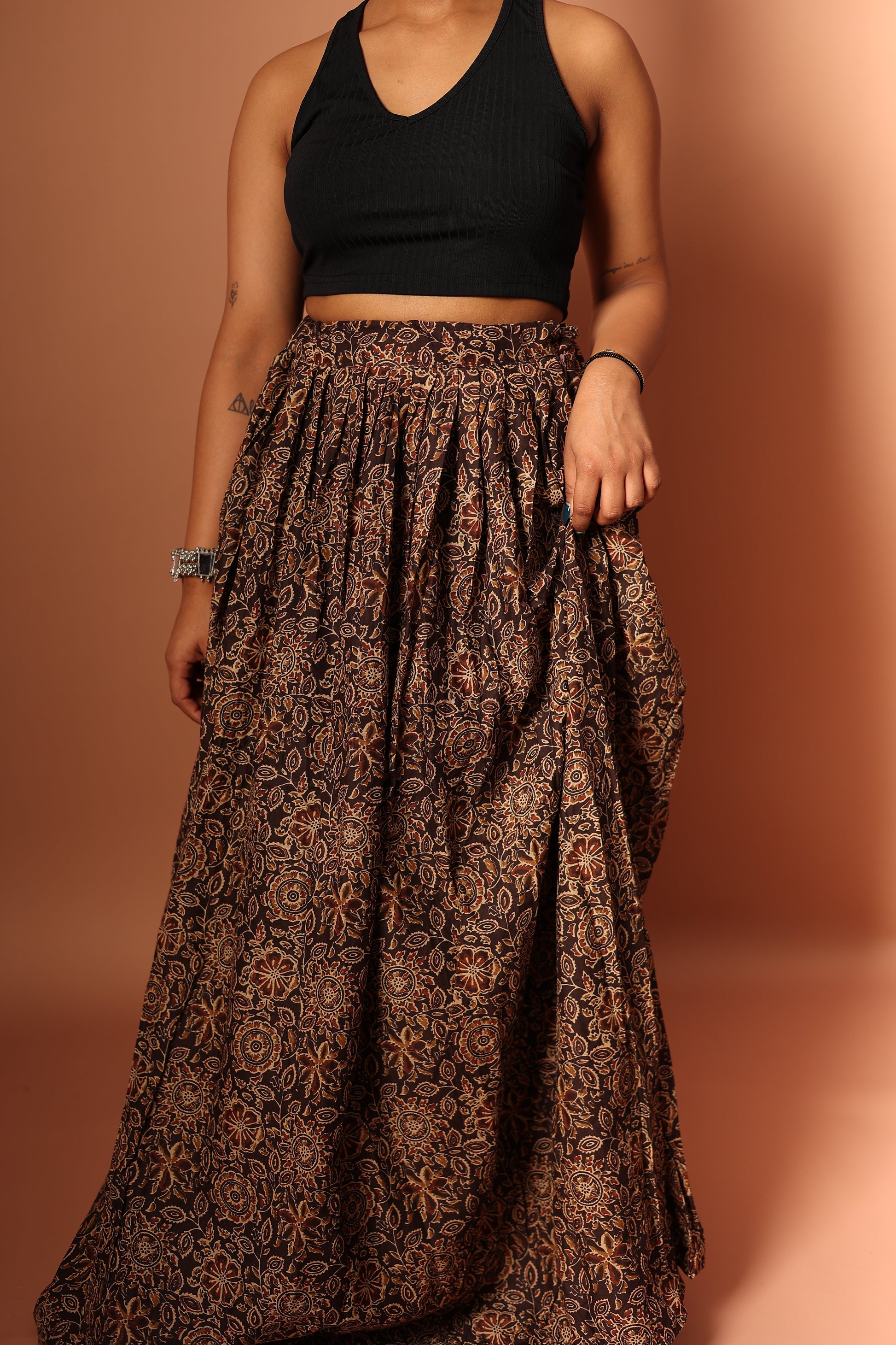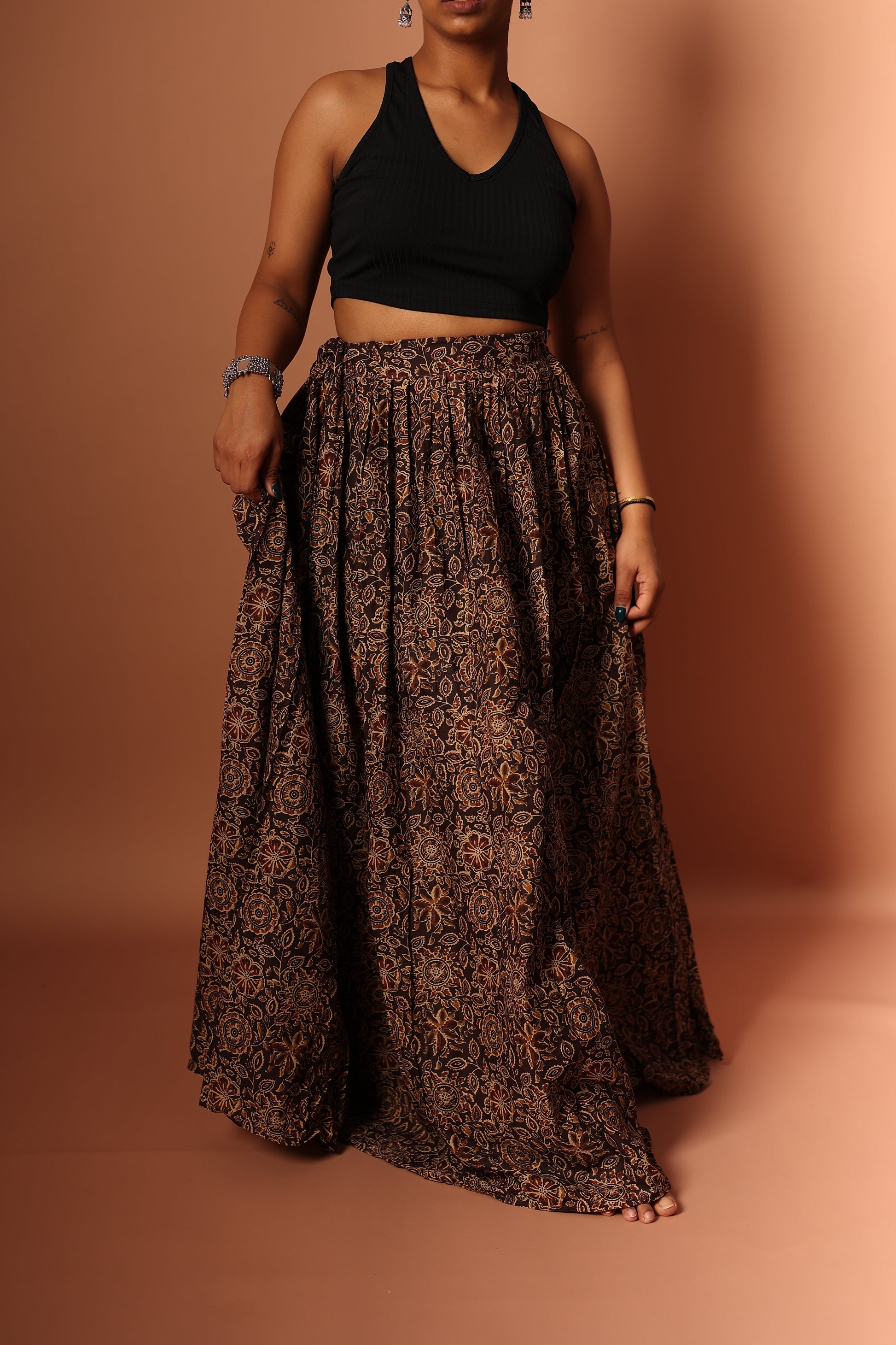 This Pure Cotton Blue Maxi Skirt features a unique table print, blending traditional motifs with modern style. Made from 100% breathable cotton, it offers comfort and a flattering flow. The brown color adds a pop of elegance, perfect for both casual outings and special occasions. With an elastic waistband, it ensures a comfortable, effortless fit. Pair it with a simple top to let the skirt shine.