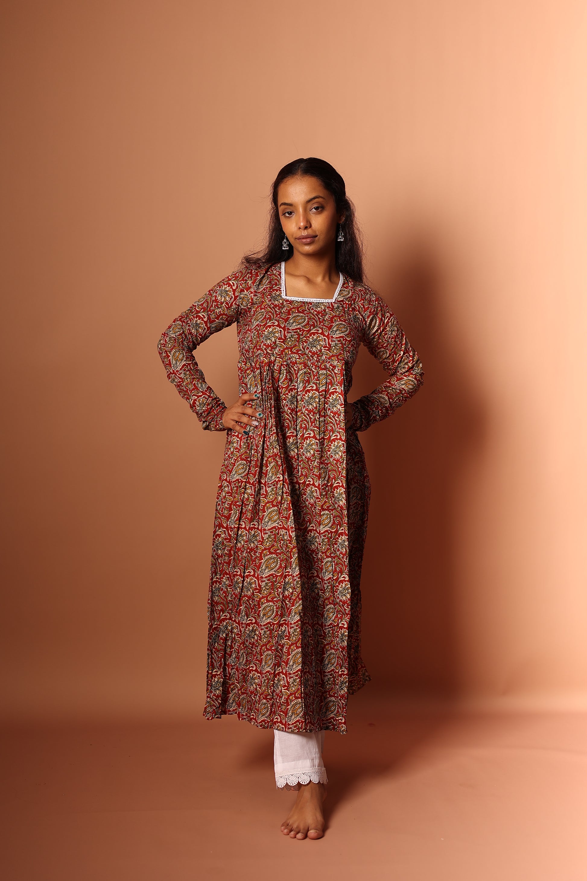 This pure cotton Anarkali kurta set is a perfect blend of elegance and comfort. The kurta features a square neckline at the front and back, with intricate lace detailing along the neck. It is paired with matching pure cotton white pants, which also showcase delicate lace accents. Ideal for both festive and casual occasions, this set offers a timeless, sophisticated look.