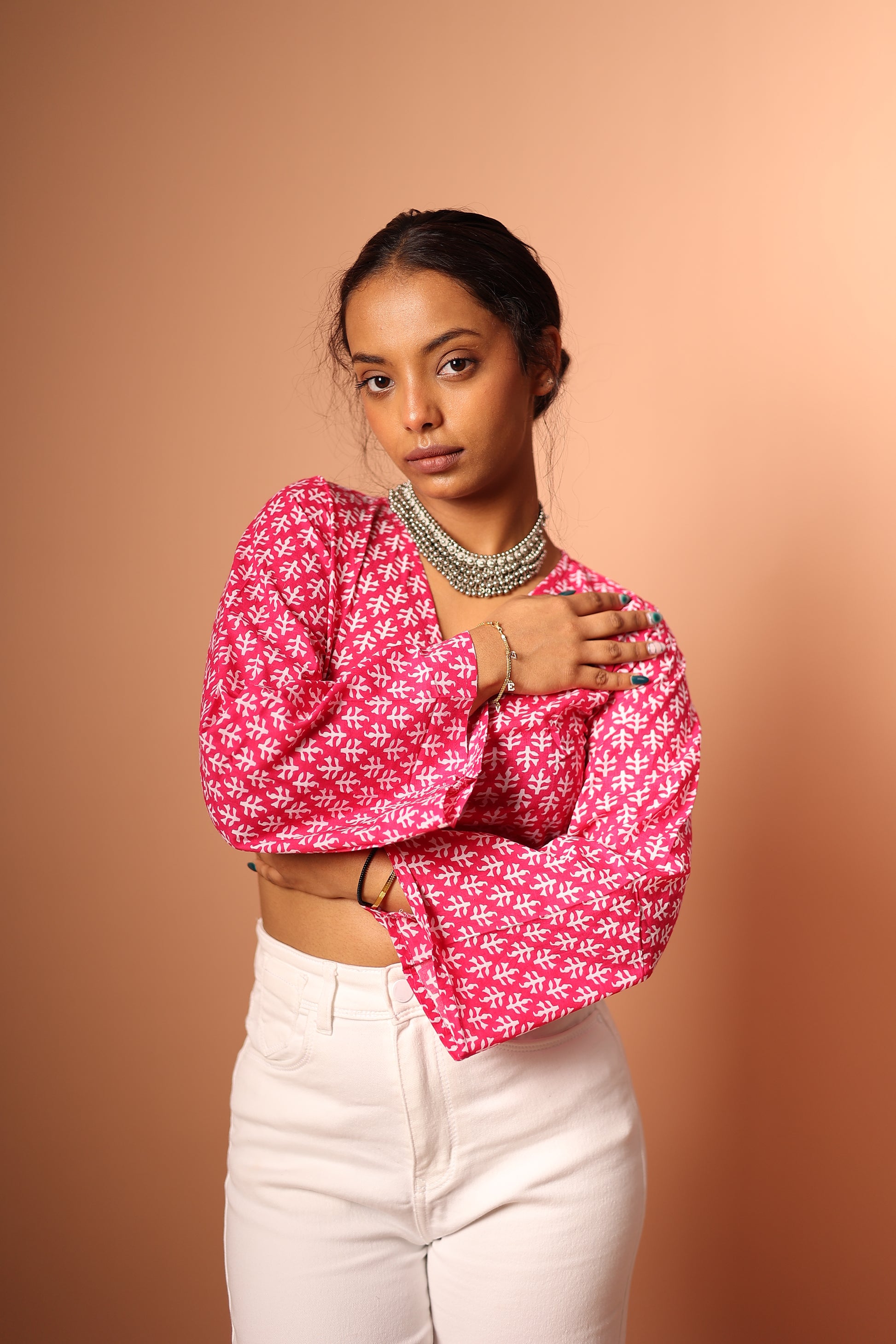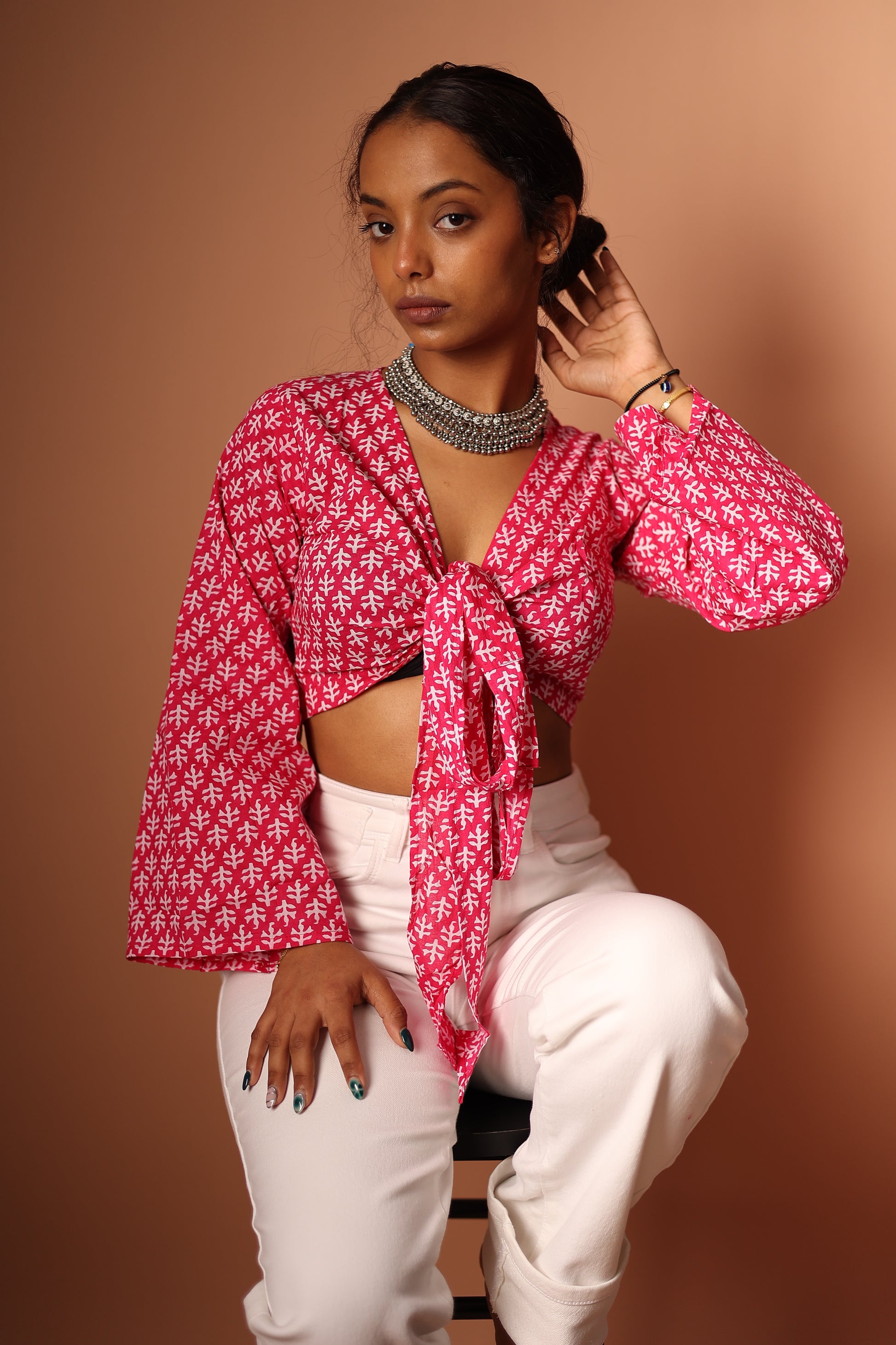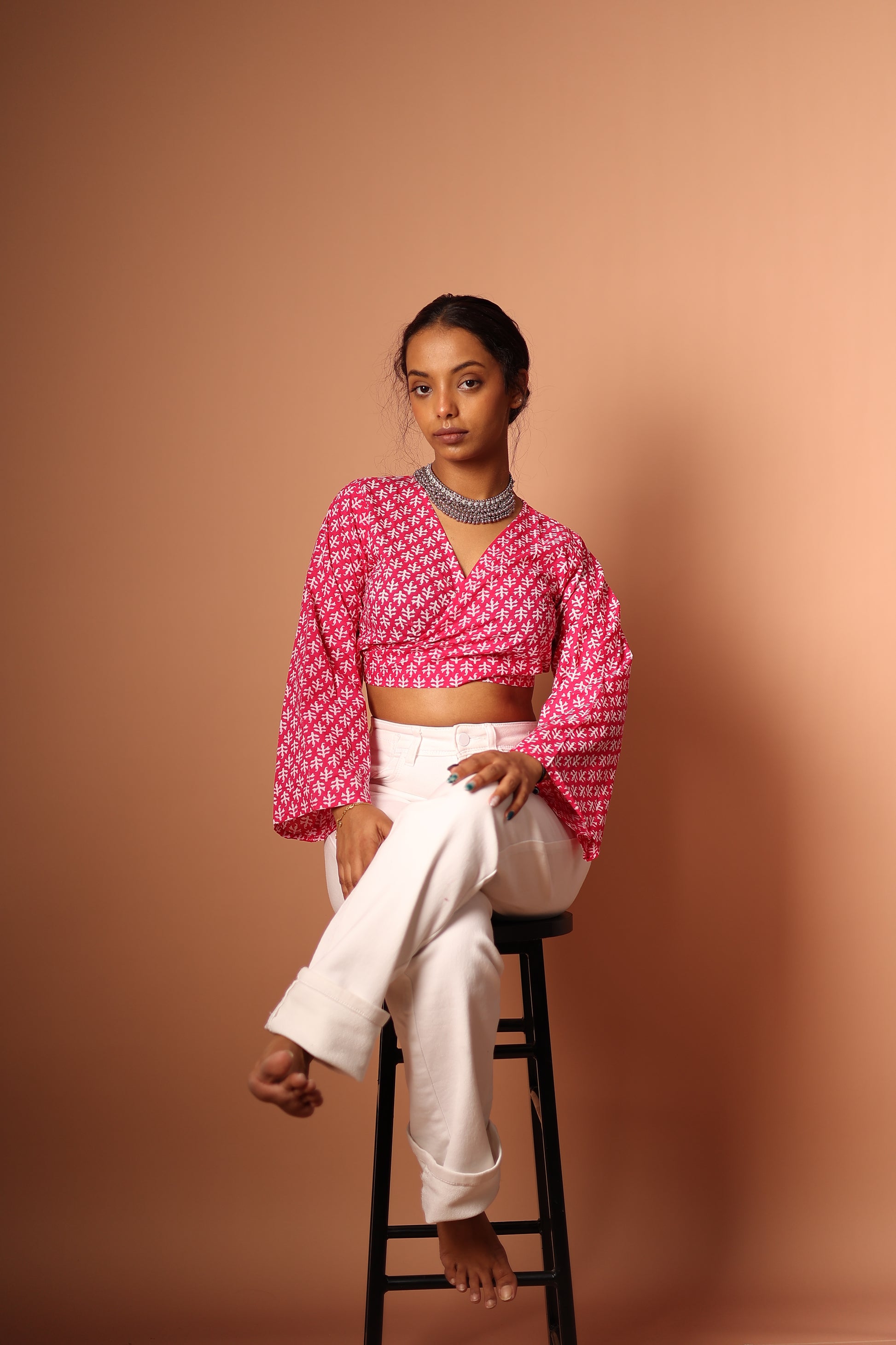 Introducing our wrap top, crafted from pure cotton for ultimate comfort and breathability. This stylish crop top features bell sleeves and can be worn in two ways: tie a front knot for a bold look, or wrap it around and knot at the back for a more sophisticated style. Pair it with a skirt for a feminine look or wear it with a pair of pants for a casual vibe.