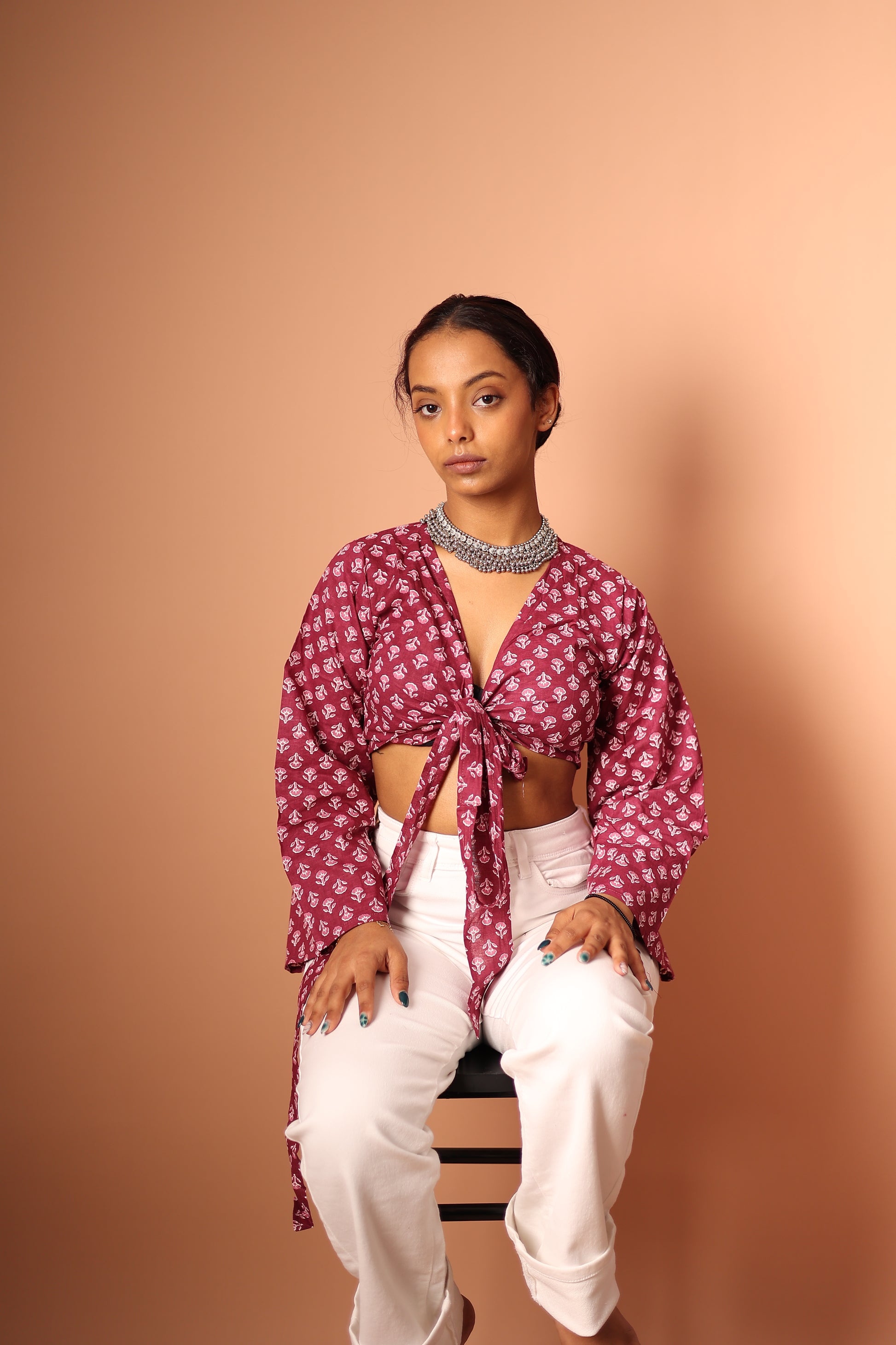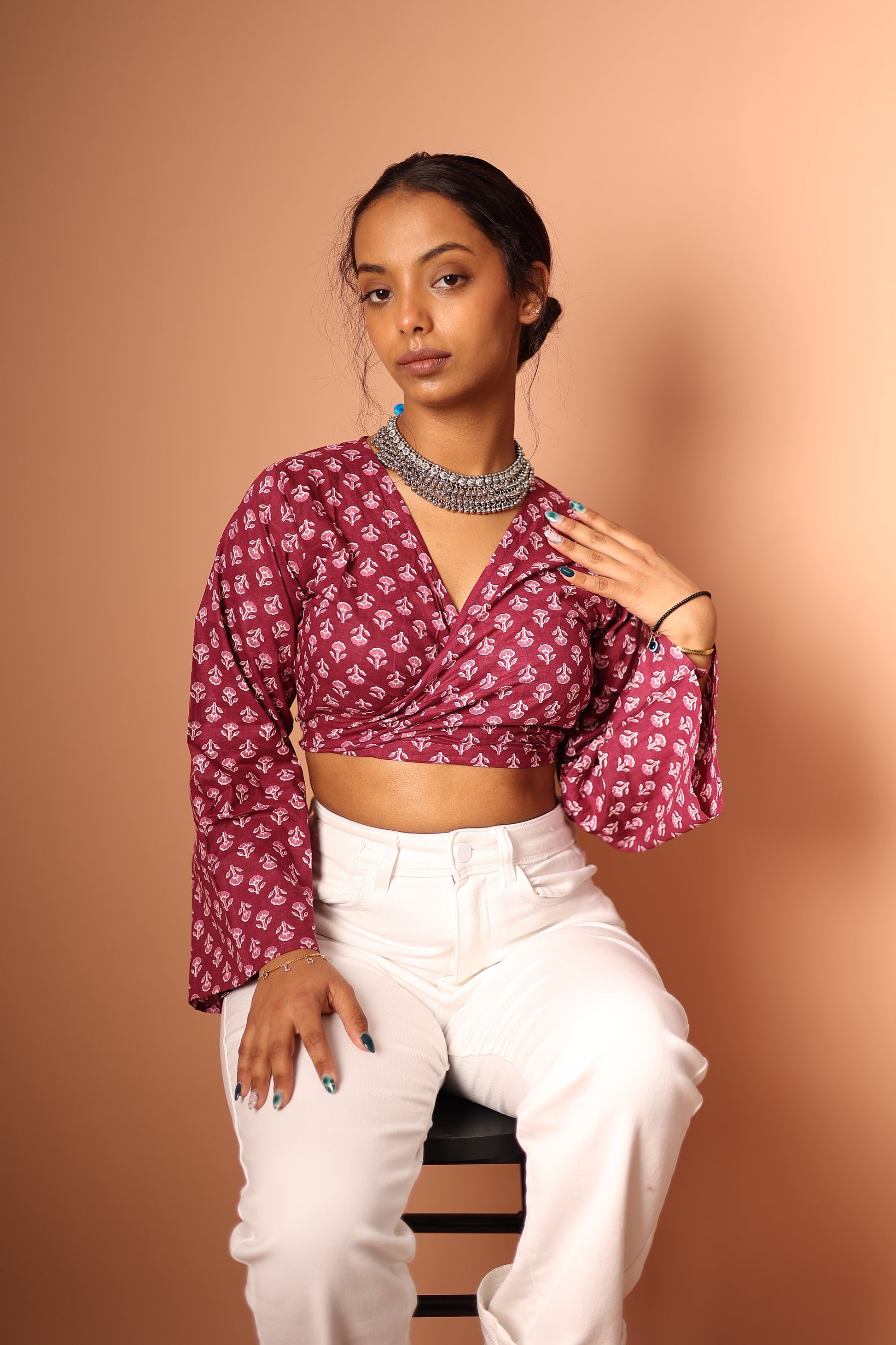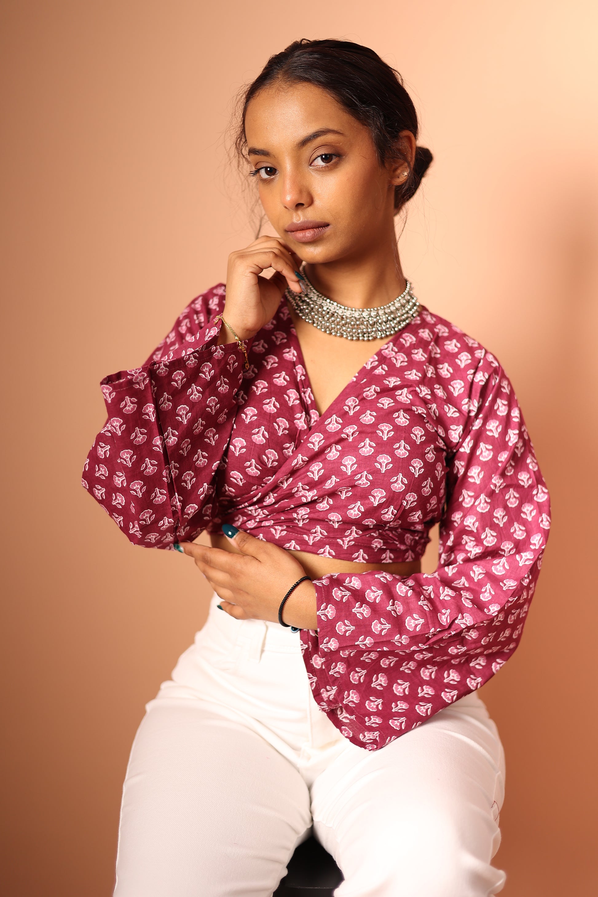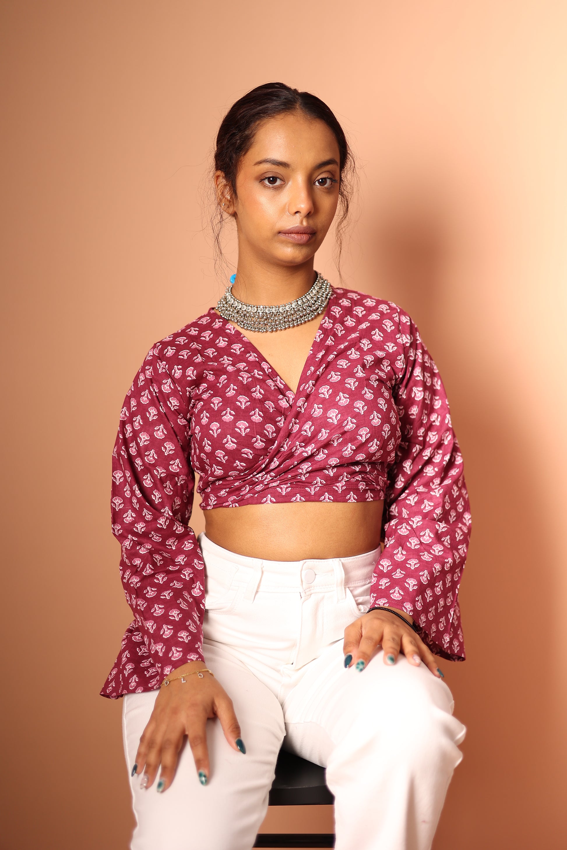 Introducing our wrap top, crafted from pure cotton for ultimate comfort and breathability. This stylish crop top features bell sleeves and can be worn in two ways: tie a front knot for a bold look, or wrap it around and knot at the back for a more sophisticated style. Pair it with a skirt for a feminine look or wear it with a pair of pants for a casual vibe.